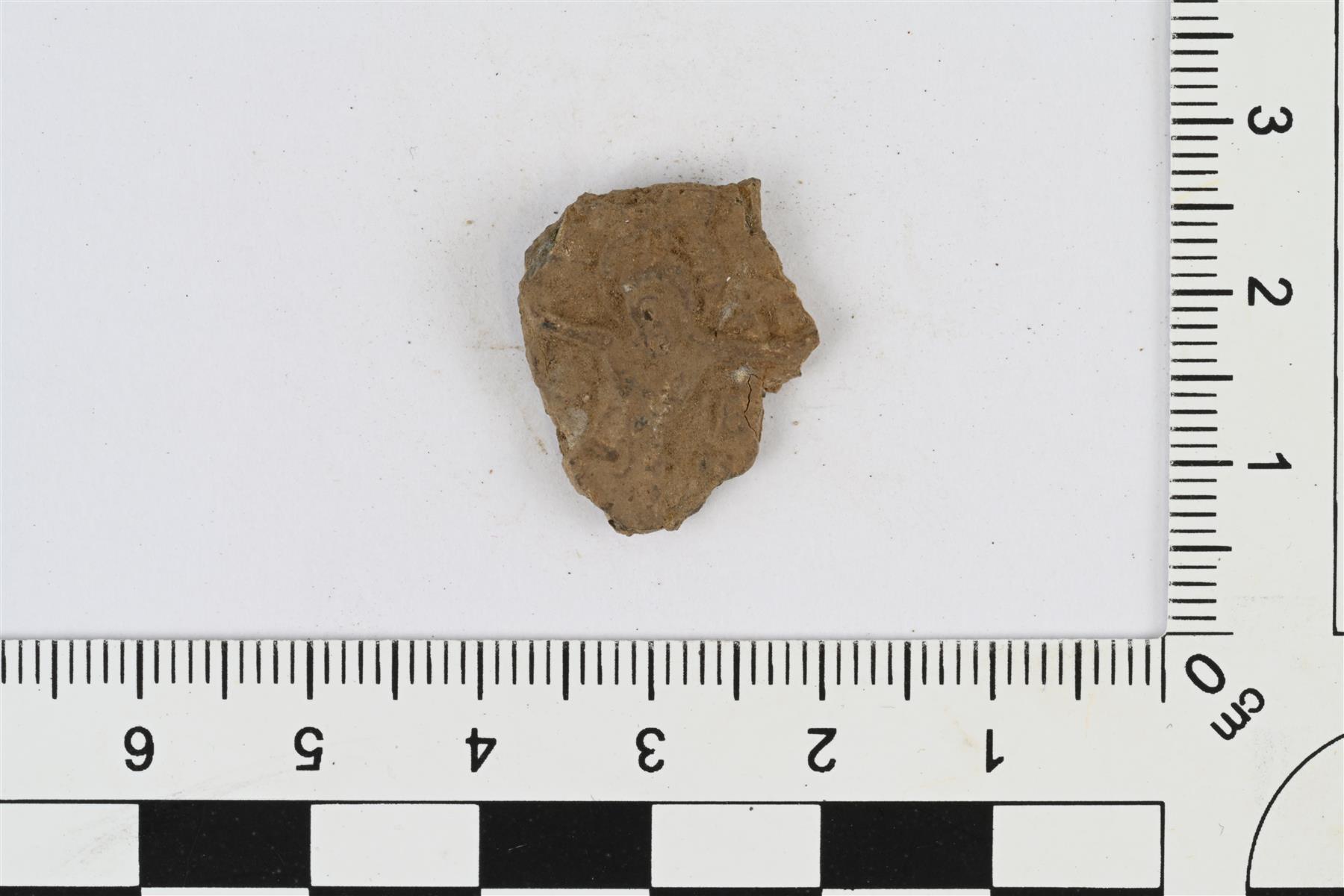 | Metalli-ikonin pieni katkelma. Luultavasti tinaseosta. Molemmilla puolilla reliefikoristelua, toisella puolella ristiinnaulitun kuva. | |