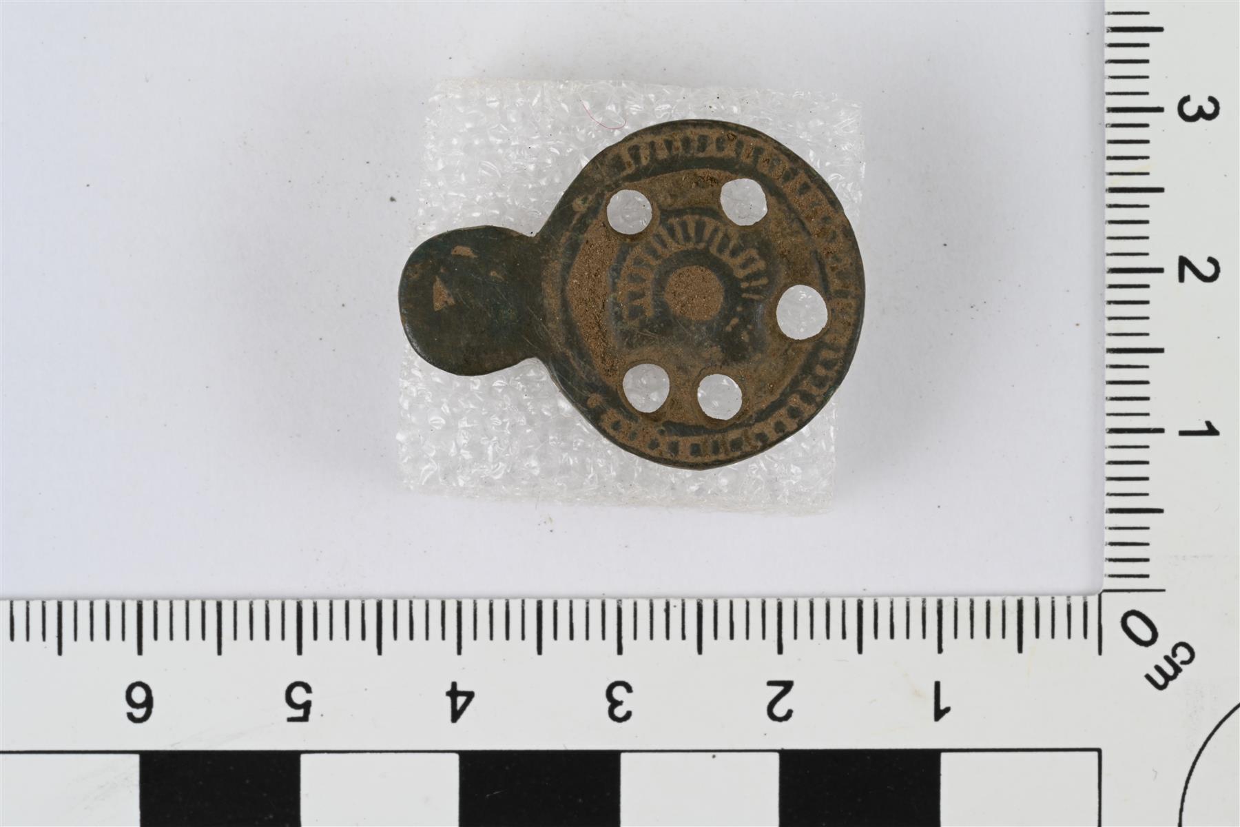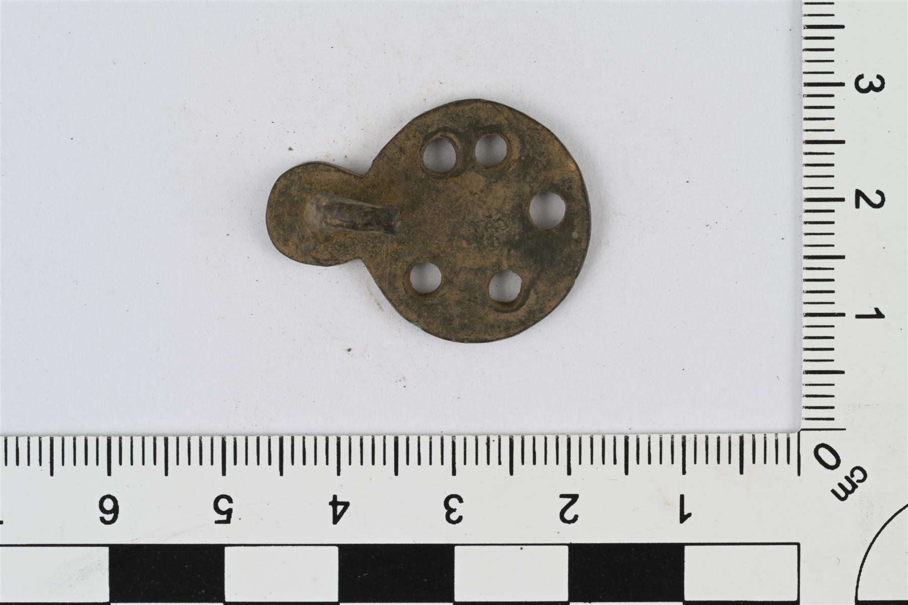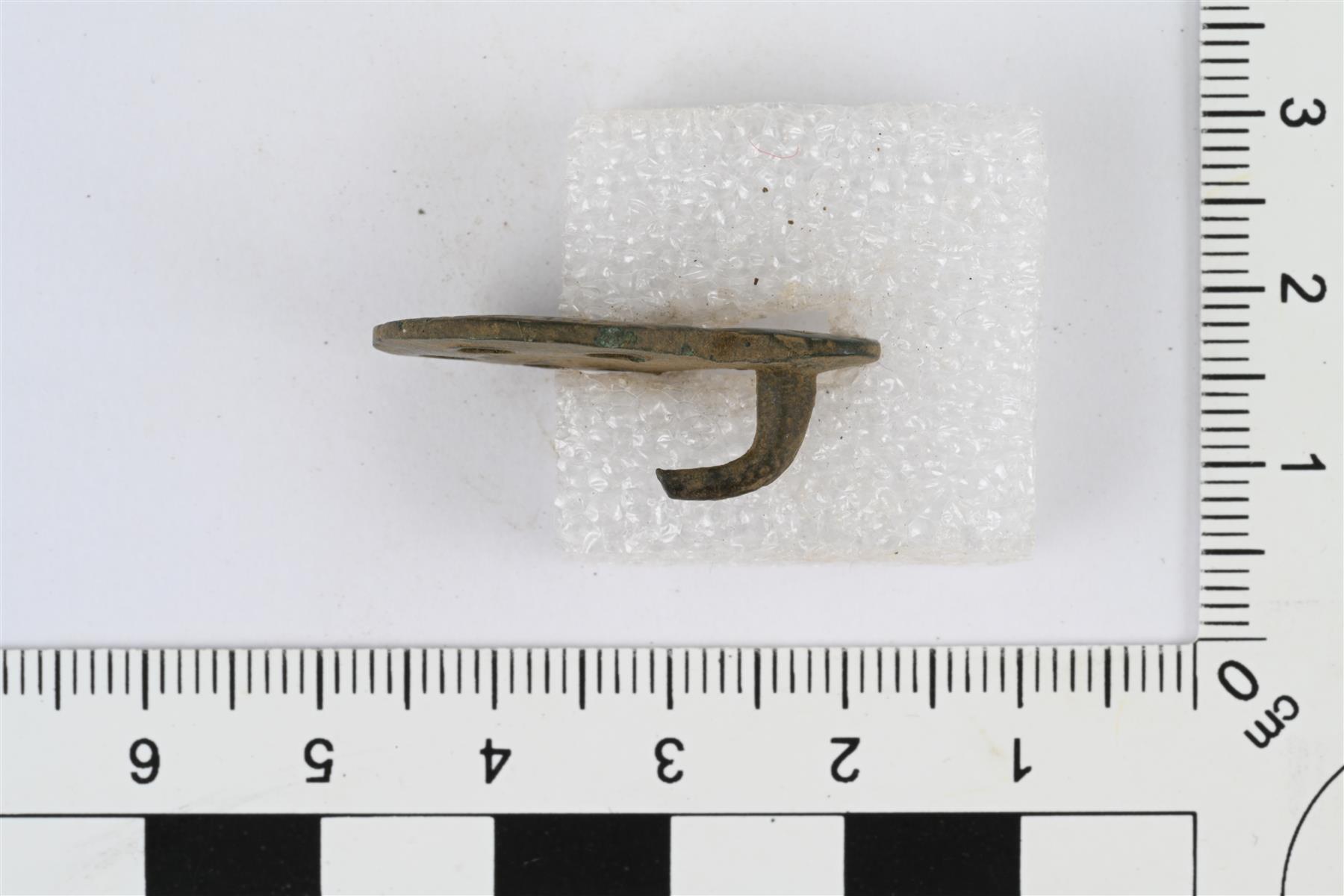 | Vaatehakanen. Pyöreä levy, jonka reunassa pienempi pyöreä uloke. Ulokkeen taustapuolella koukku. Levyosassa koristeluna sisäkkäisiä kehiä, joista uloin ja toiseksi sisin ovat poikkiviivaiset. Poikkiviivaisten kehien välissä olevan sileän kehän kohdalla viisi pientä pyöreää reikää. | |
