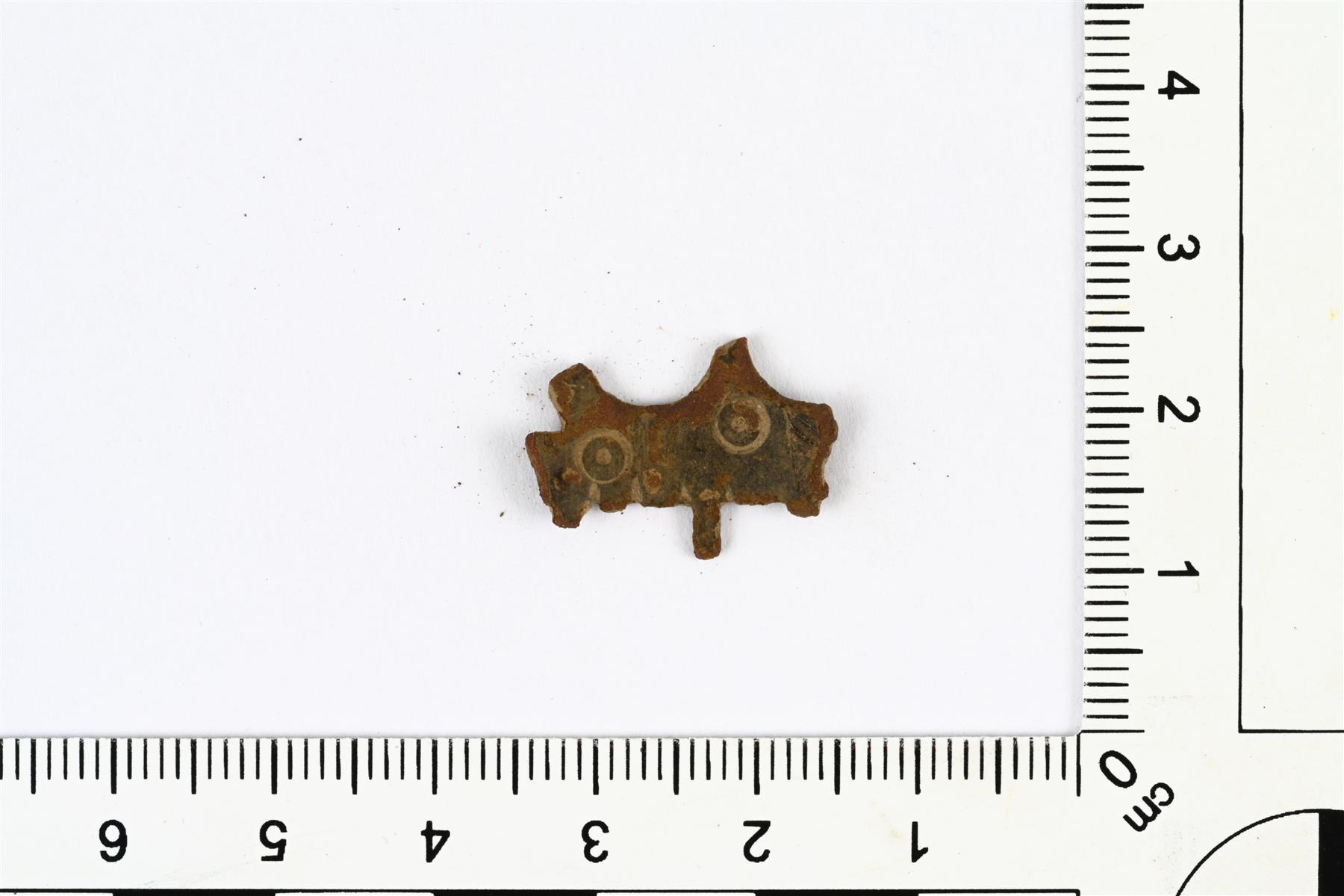 | Kampariipuksen katkelma. Kummallakin puolella on koristeluna häränsilmäleimoja. Kamman piikit ovat katkenneet. | |