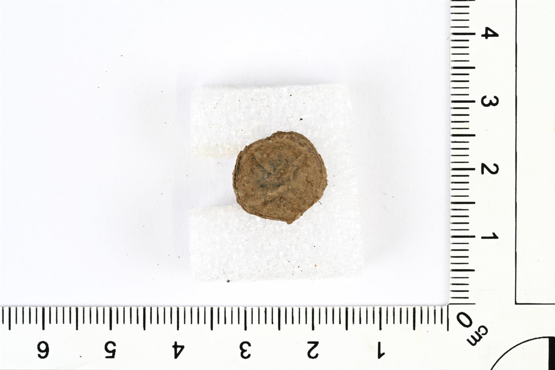 | Kiekkonappi. Etupuolella on yksinkertainen ristikuvio. Taustapuolen kiinnityslenkki on hajonnut. | |