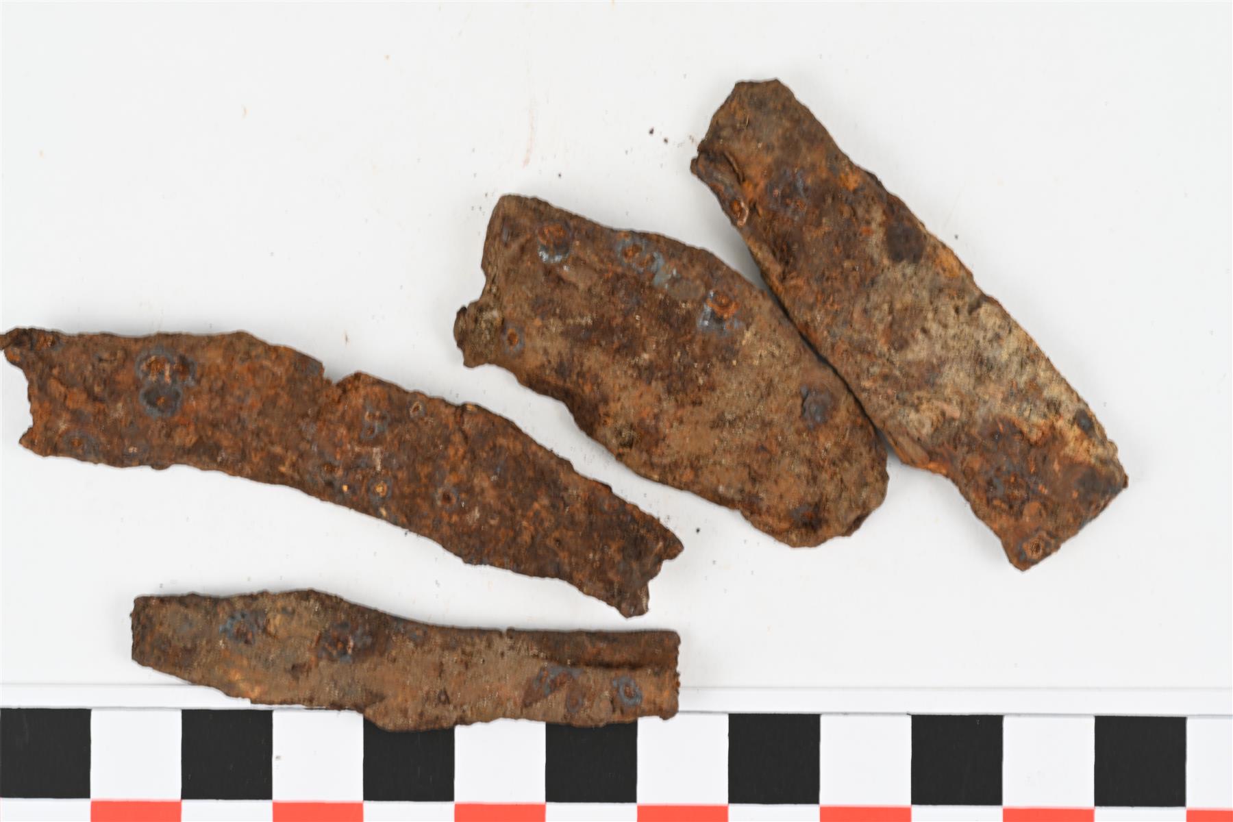 | Neljä pitkää, kapeahkoa ja melko ohutta rautakappaletta. Levymäisiä. Epäsäännöllisen muotoisia. Ei selkeitä teriä tai muita tunnistettavia funktionaalisia muotoja. Mitat ilmoitettu yhdelle kappaleelle. | |