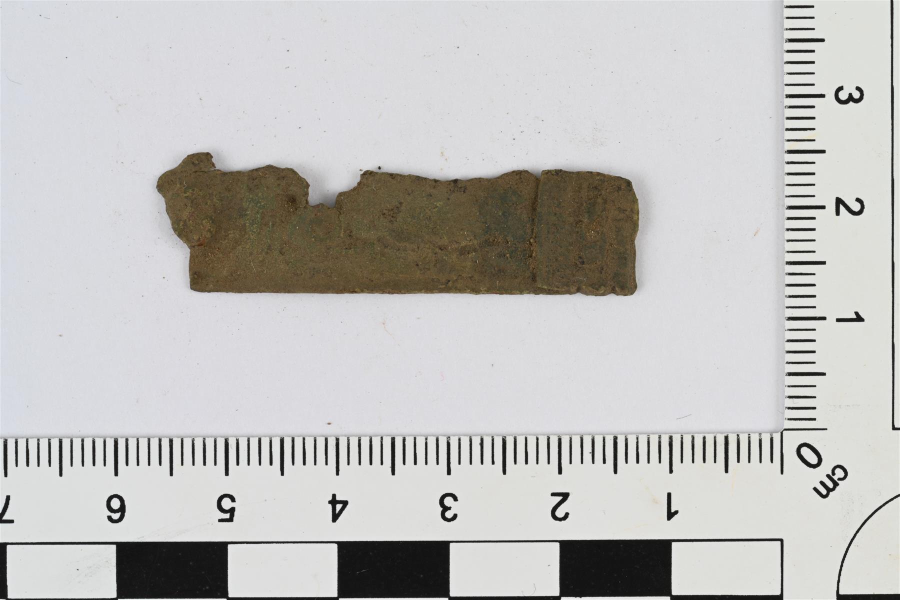 | Koristellun kupariseoslevyn katkelma. Heidi Martiskainen 21.11.2023 KM45898:2_1_pronssilevy |