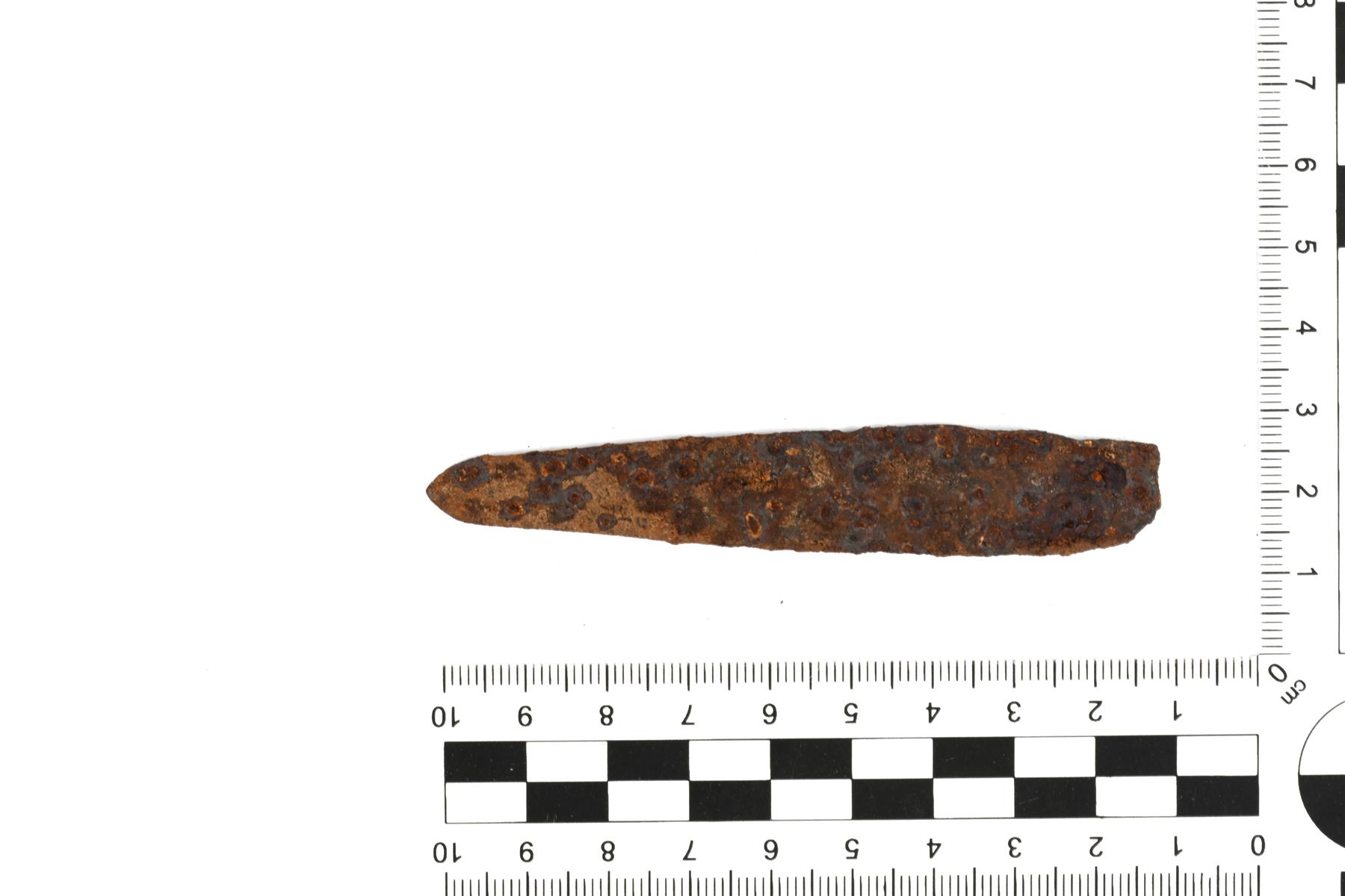 | Rautakärjen kärkikatkelma. Nuolen- tai keihäänkärjestä. Muotonsa ja mittasuhteidensa puolesta muistuttaa kärkeä KM45806:1. Poikkileikkaus on kuitenkin muodoltaan epäselvempi ja lähinnä linssimäinen. Kärkikavennus alkaa noin 7 mm päässä kärjestä. | |