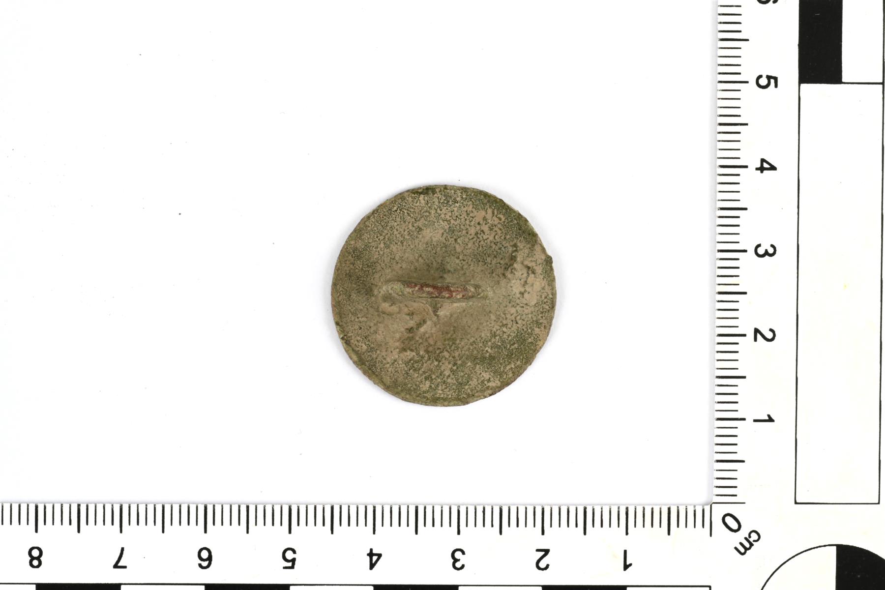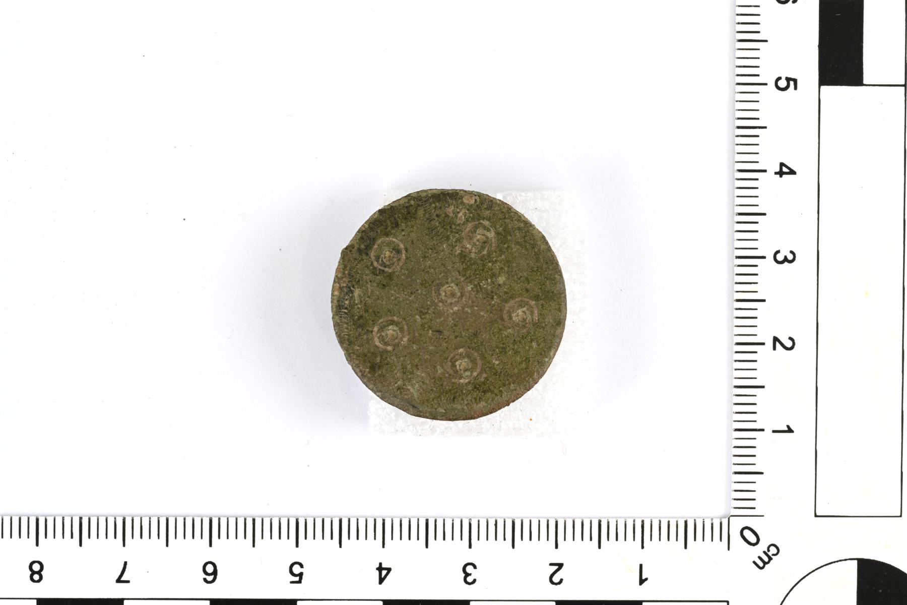 | Pyöreä nappi. Etupuolella on koristeena kuusi häränsilmäleimaa ja siksak-kuvioisia viivoja. Vastaavanlainen on löytynyt Kalevanmäen kalmistosta, n. 1,6 km päästä (KM 39450: 1). | |