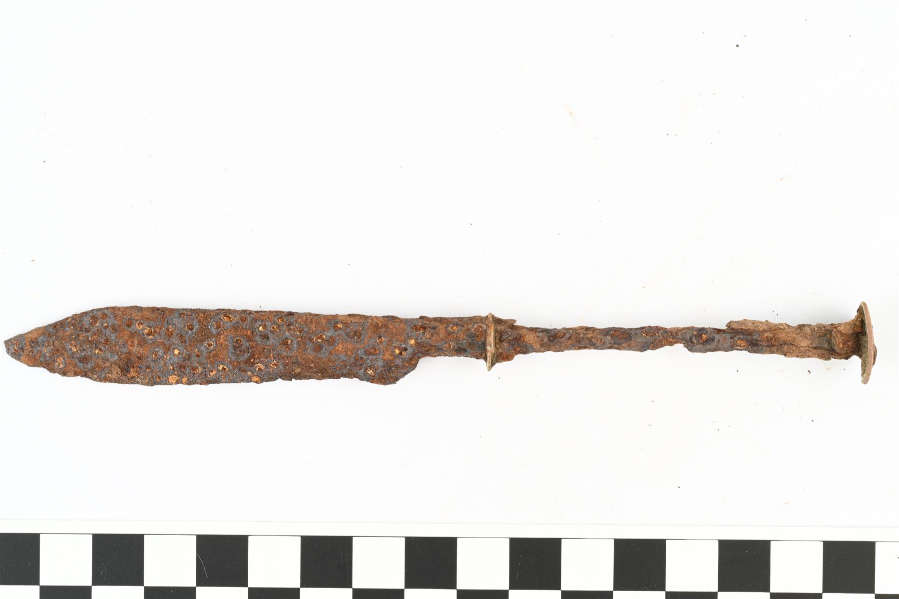 | "Yläruotoisen" veitsen terä ja kahvaruoto. Terä suorahamarainen ja voimakkaan kärkitaitteinen. Hamaran kanssa samassa linjassa on poikkileikkaukseltaan pyöreähkö kaula, jonka tyveä kiertää kupariseosrengas. Kaulasta jatkuvan ruodon kannassa ohut soikeahko/pisaranmuotoinen kupariseoshela (lape kahvan kantaa vasten). Terän poikkileikkaus kolmiomainen (viisteetön). | |