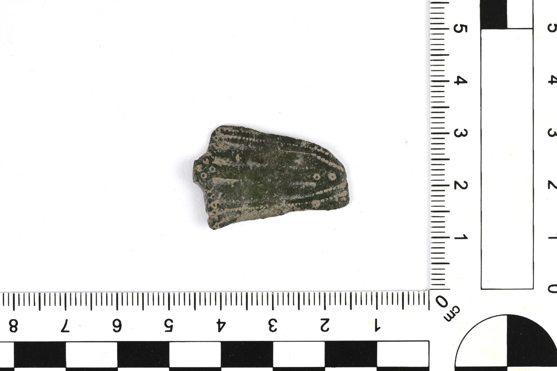 | Ohuesta levystä tehdyn rannerenkaan katkelma. Etupuolella on koristeluna pisteviivoja ja häränsilmäleimoja. | |