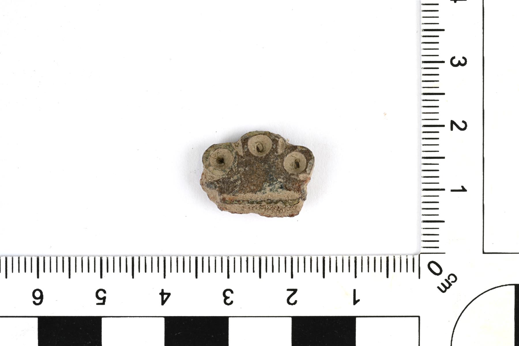 Pöytäveitsen päätehela ja pala ruodosta. Päädyssä on kolme pyöreää reikää, joista keskimmäinen on sivuilla olevia ylempänä. Vrt. Holtmann Abb. 165. | |