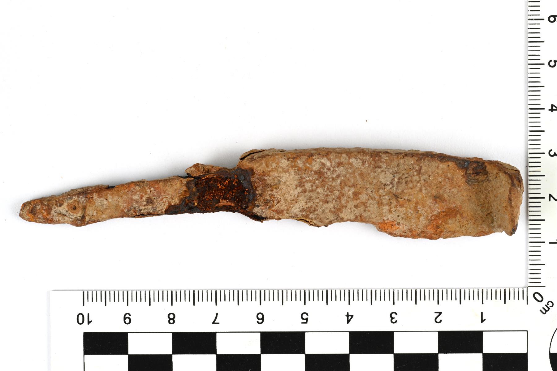Kaarevahamarainen ja piiloruotoinen veitsi. Terän poikkileikkaus on kolmiomainen. Terä on taitettu ja kärki puuttuu. | |
