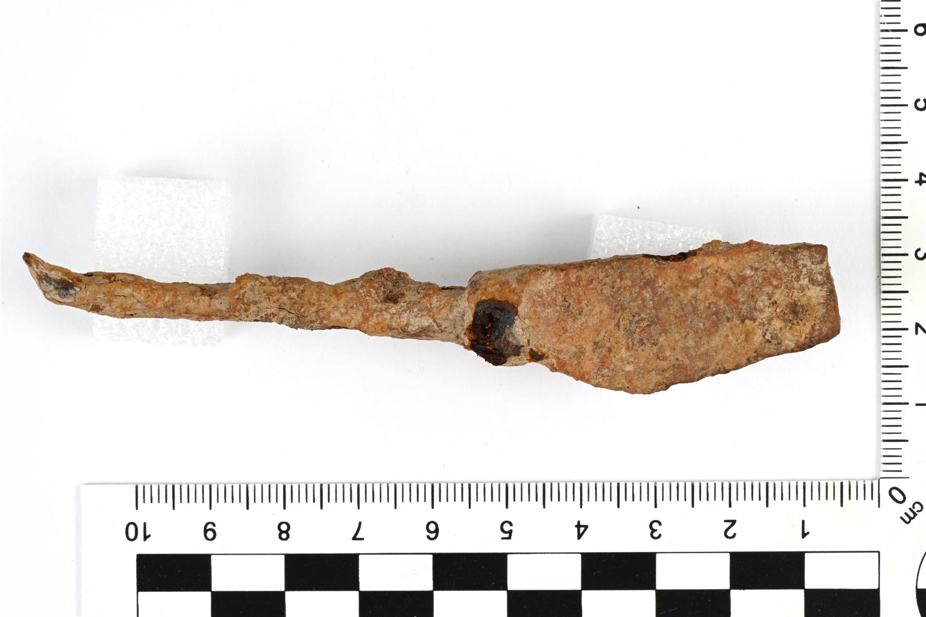 Pöytäveitsen katkelma. Ruodon yläosassa on pyöreä paksunnos. Ruodon alaosa on kapeampi ja poikkileikkaukseltaan neliömäinen. | |