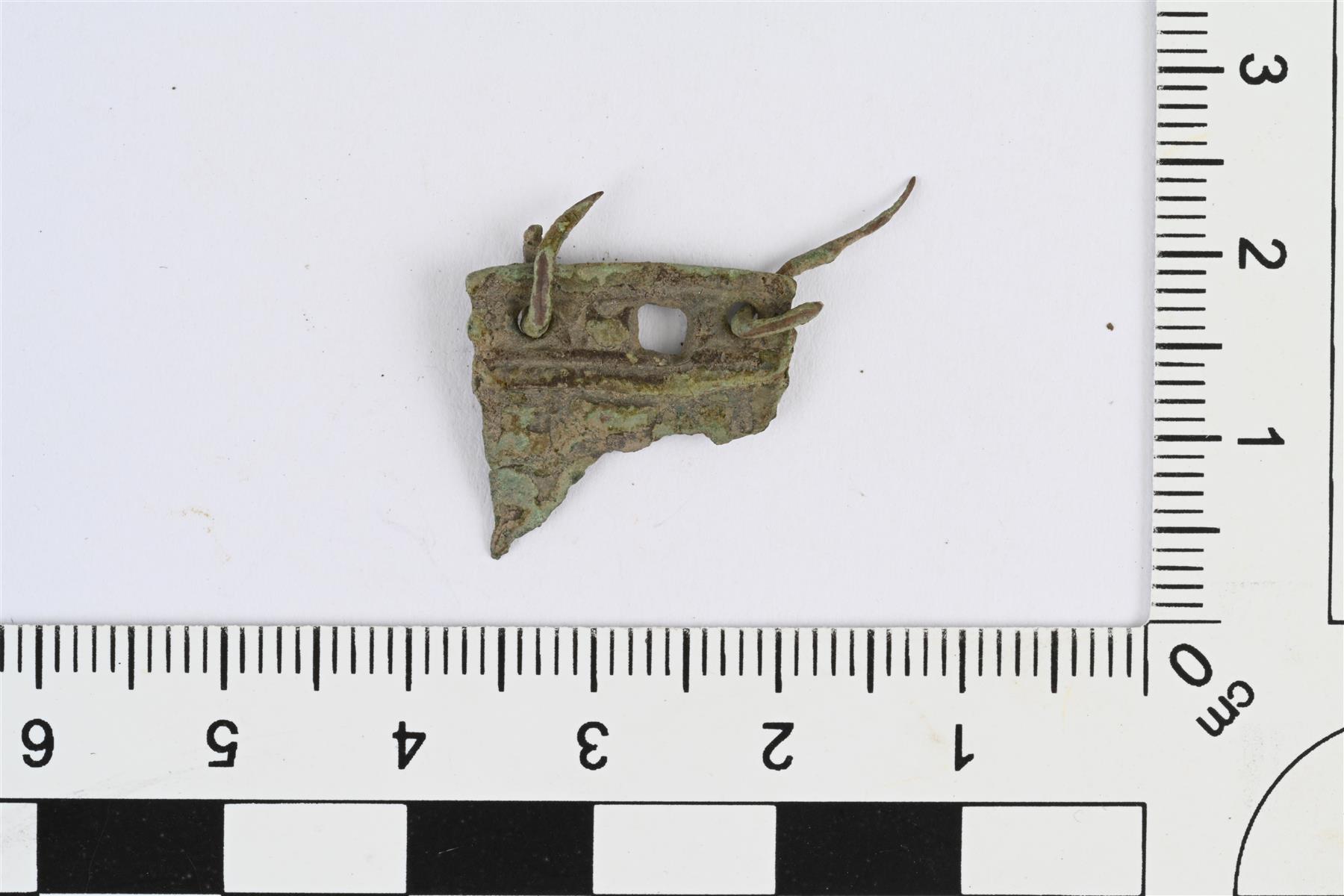 | Kupariseosesineen katkelma. Katkelma koristellun levyn reunasta. Ehjässä suorassa reunassa kaksi pientä pyöreää reikää, joiden läpi pujotettu hyvin ohuesta vartaasta tai langasta taivutetut koukkumaiset lenkit. Näiden reikien välissä suurempi neliönmuotoinen reikä. Etupuolella poikkiviivoitusta. | |