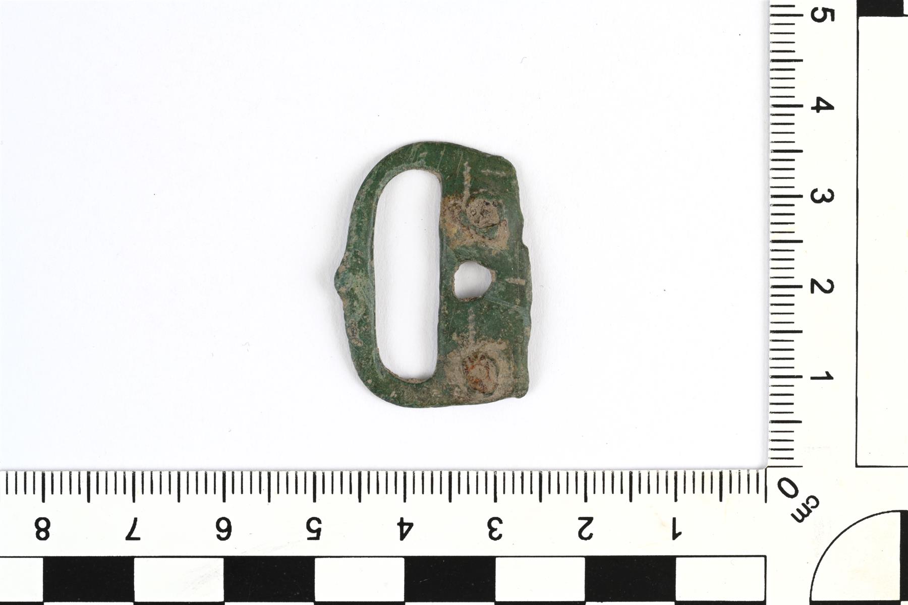 | Suorakaiteenmuotoinen hihnan- tai vyönsolki. Toisessa reunassa on neulaa varten pyöreähkö reikä. Reiän kummallakin puolella on kaksi rautaista kiinnitysniittiä. Neula puuttuu. | |