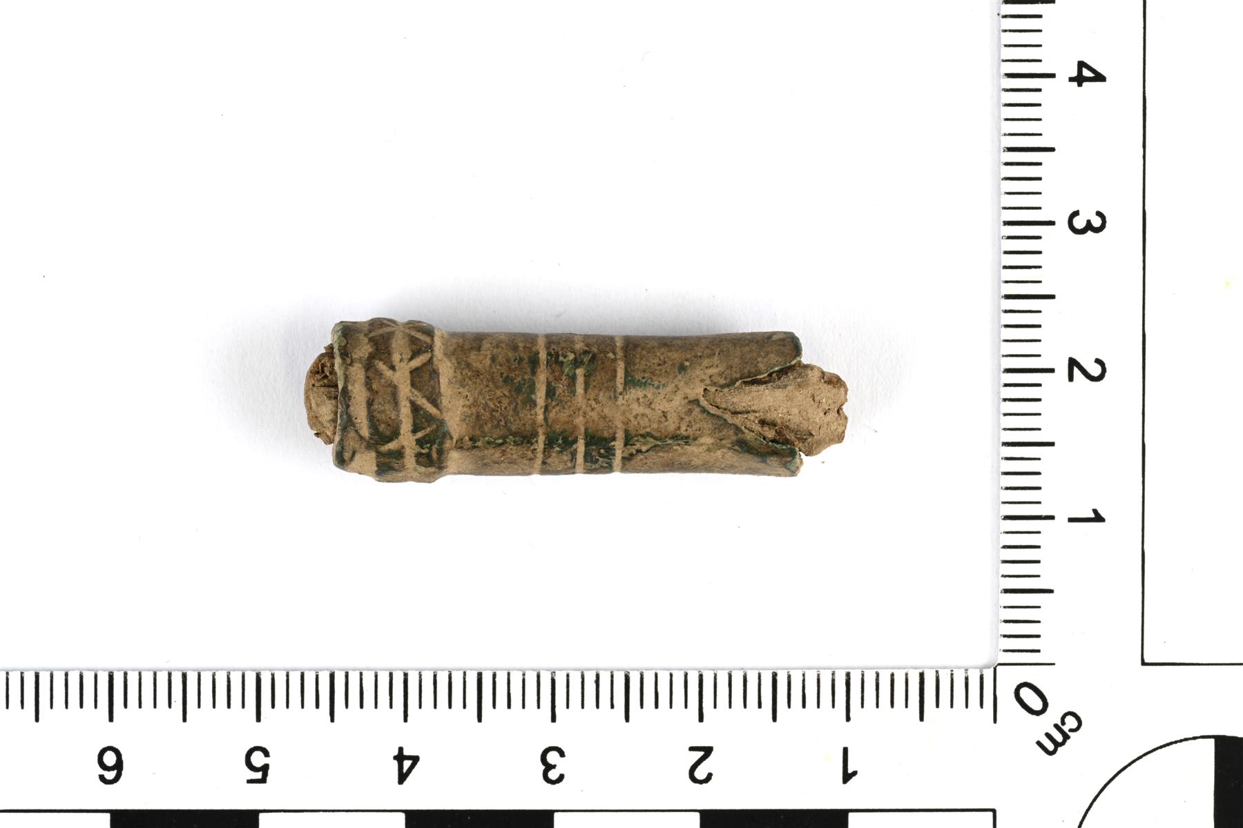 | Sylinterimäinen neulakotelon katkelma. Ehjässä päädyssä on paksunnos. Koristeluna viivauurteita. | |