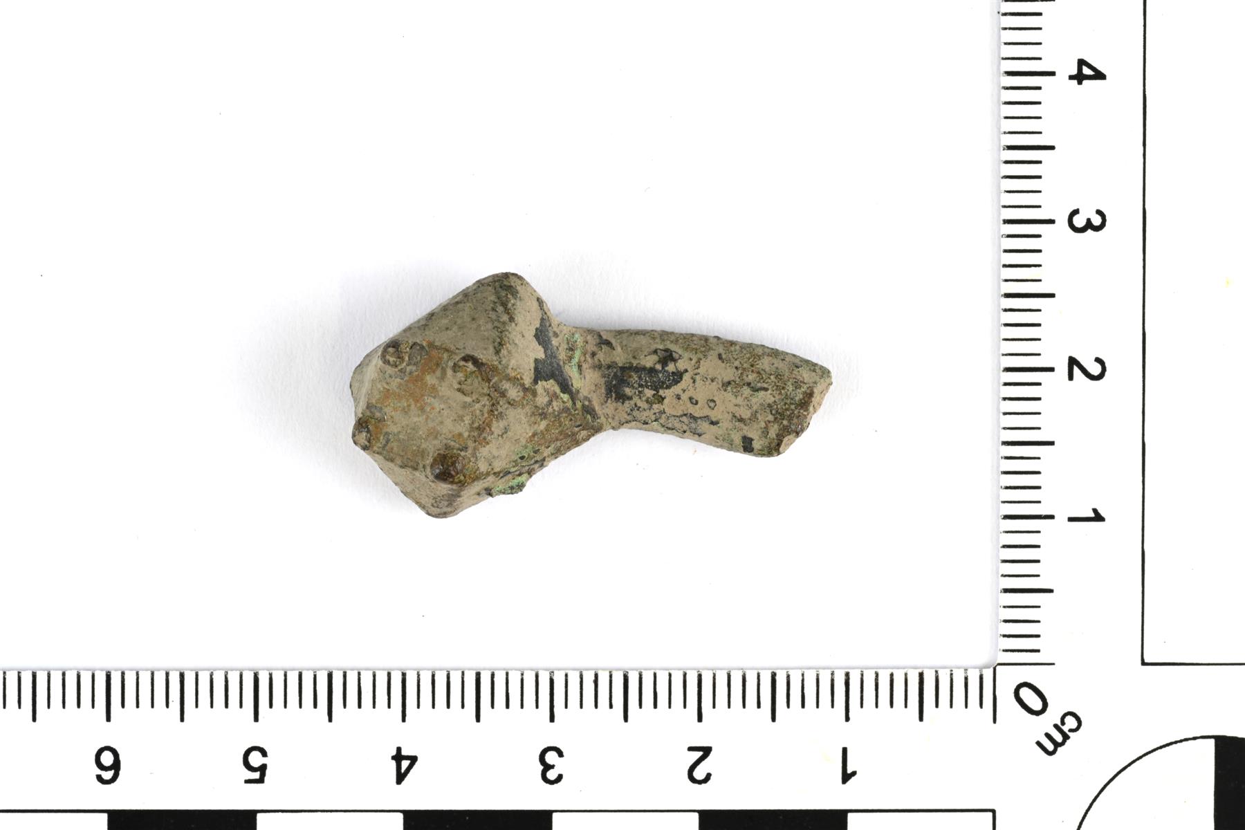 | Särmänuppisen hevosenkenkäsoljen nupin ja kehän katkelma. Nuppi on muodoltaan neliömäinen, yläkulmat on viistetty ja koristeluna on neljä tappia. Kehän poikkileikkaus on soikea. Vrt. Kivikoski Abb. 696. | |