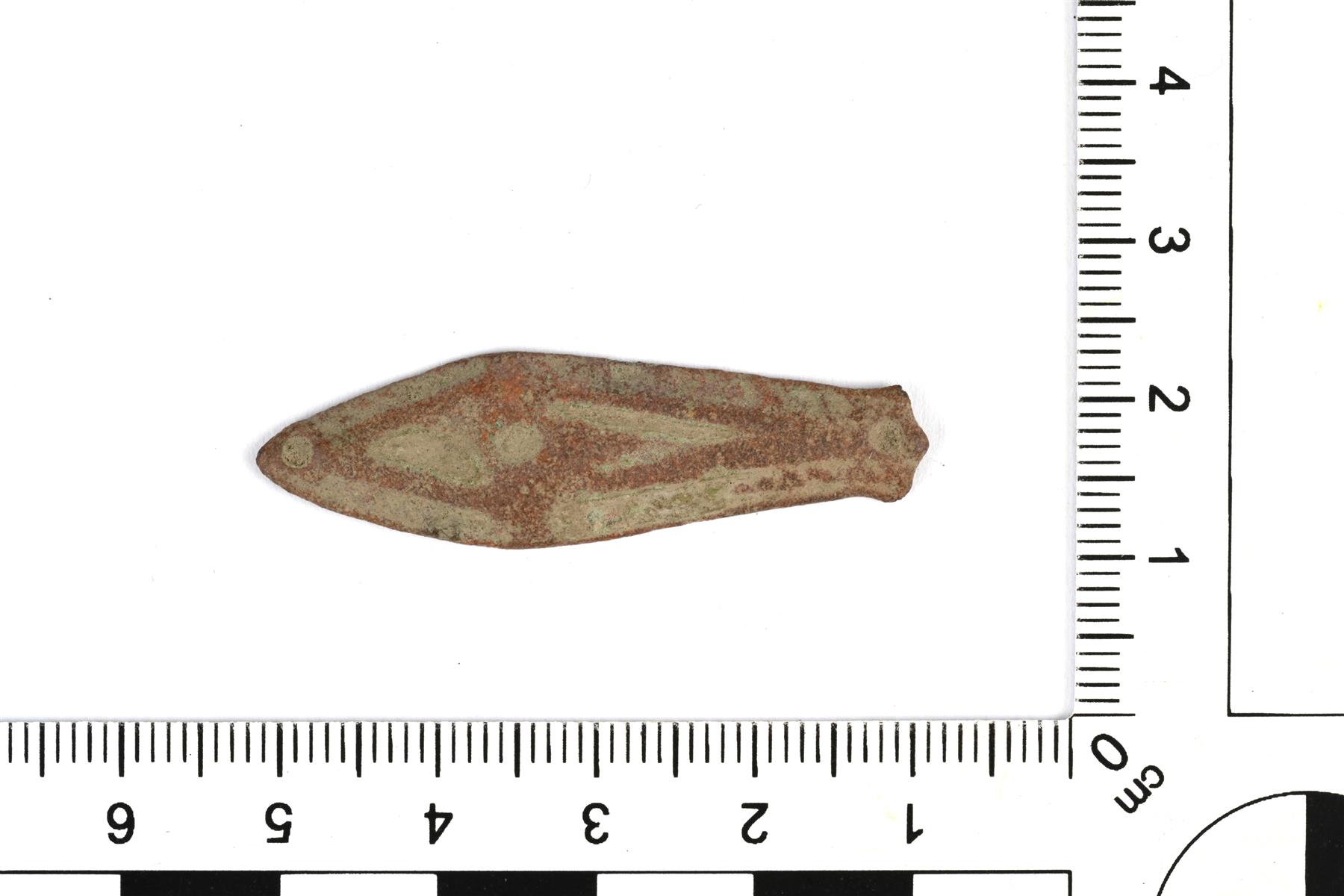 | Yksinkertainen kalanmuotoinen hela. Reunaa kiertää helmikoristeinen viiva. Taustapuoli on koverrettu. Vrt. Kivikoski Abb. 924-926. | |