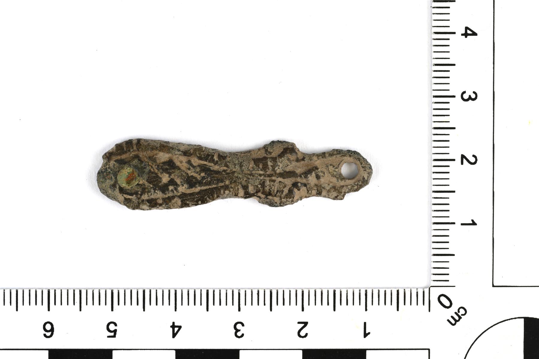 | Nauhakoristeinen kalanmuotoinen hela. Yläpäässä on ripustuslenkki. Alaosa on murentunut. Vrt. Kivikoski Abb. 924-926. | |