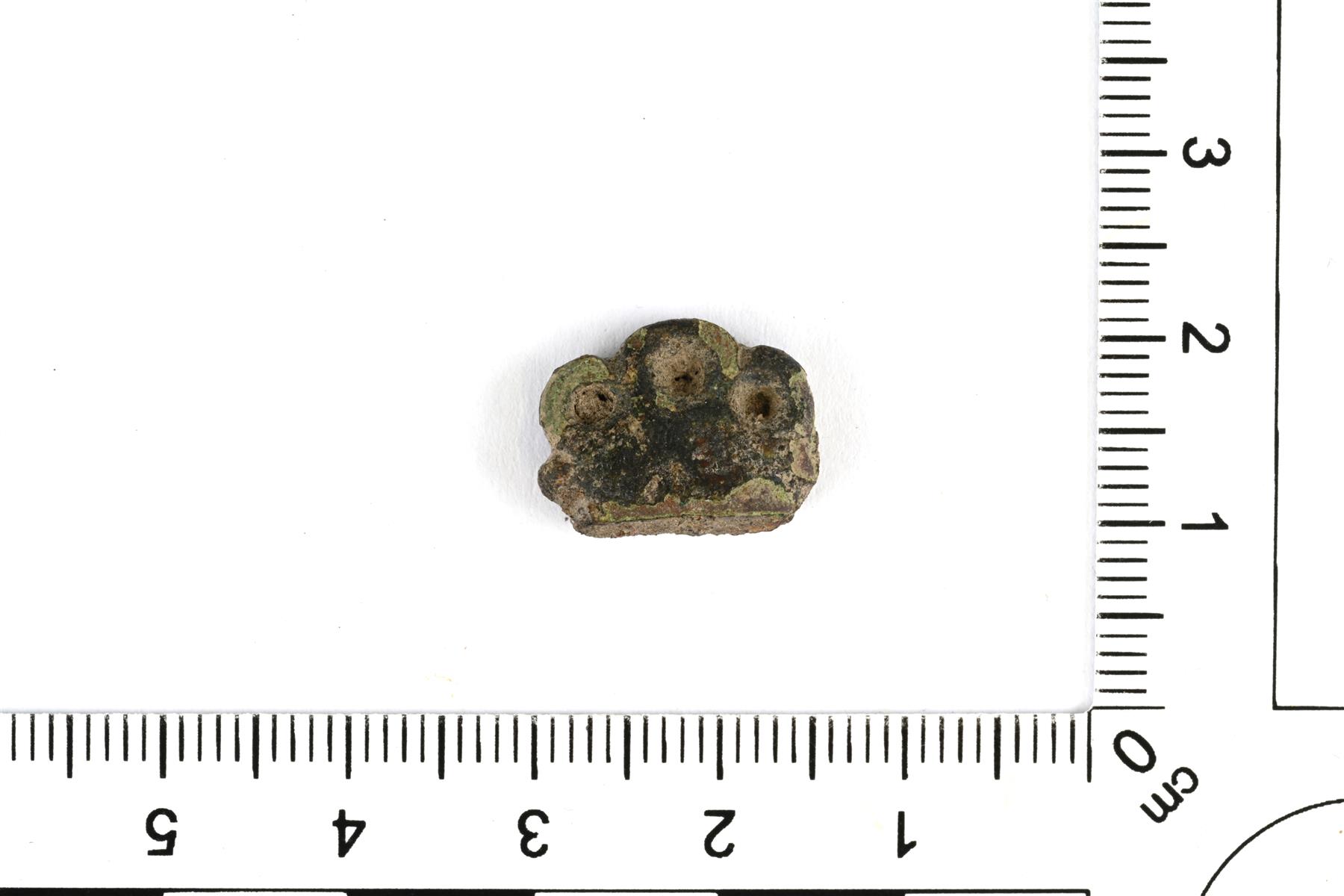 | Pöytäveitsen päätehela. Päädyssä on kolme vierekkäistä reikää. Ruodosta on tallella pieni katkelma. Vrt. Holtmann Abb. 165. | |
