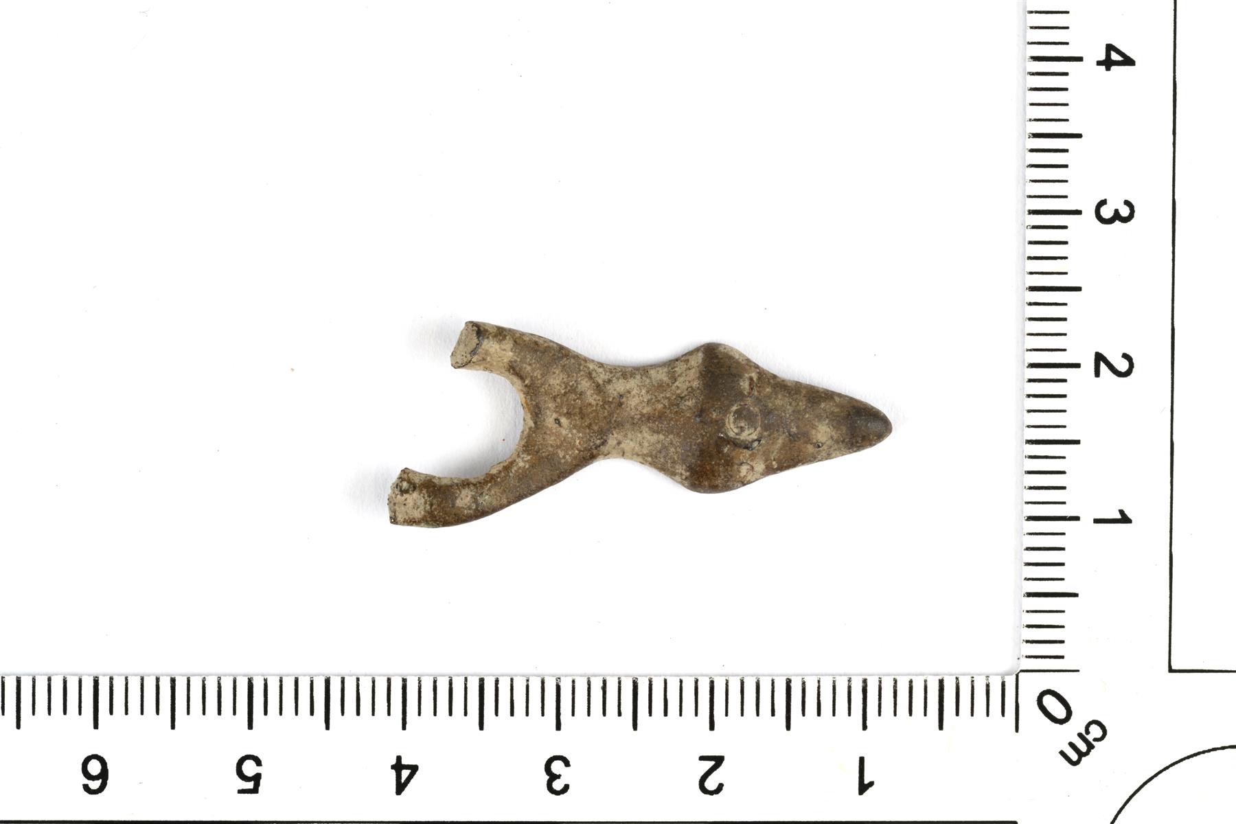 | Mahdollinen helan tai riipuksen katkelma. Alaosa on muodoltaan vinoneliö ja hajonneen yläosan jäänne on pyöreähkö. | |