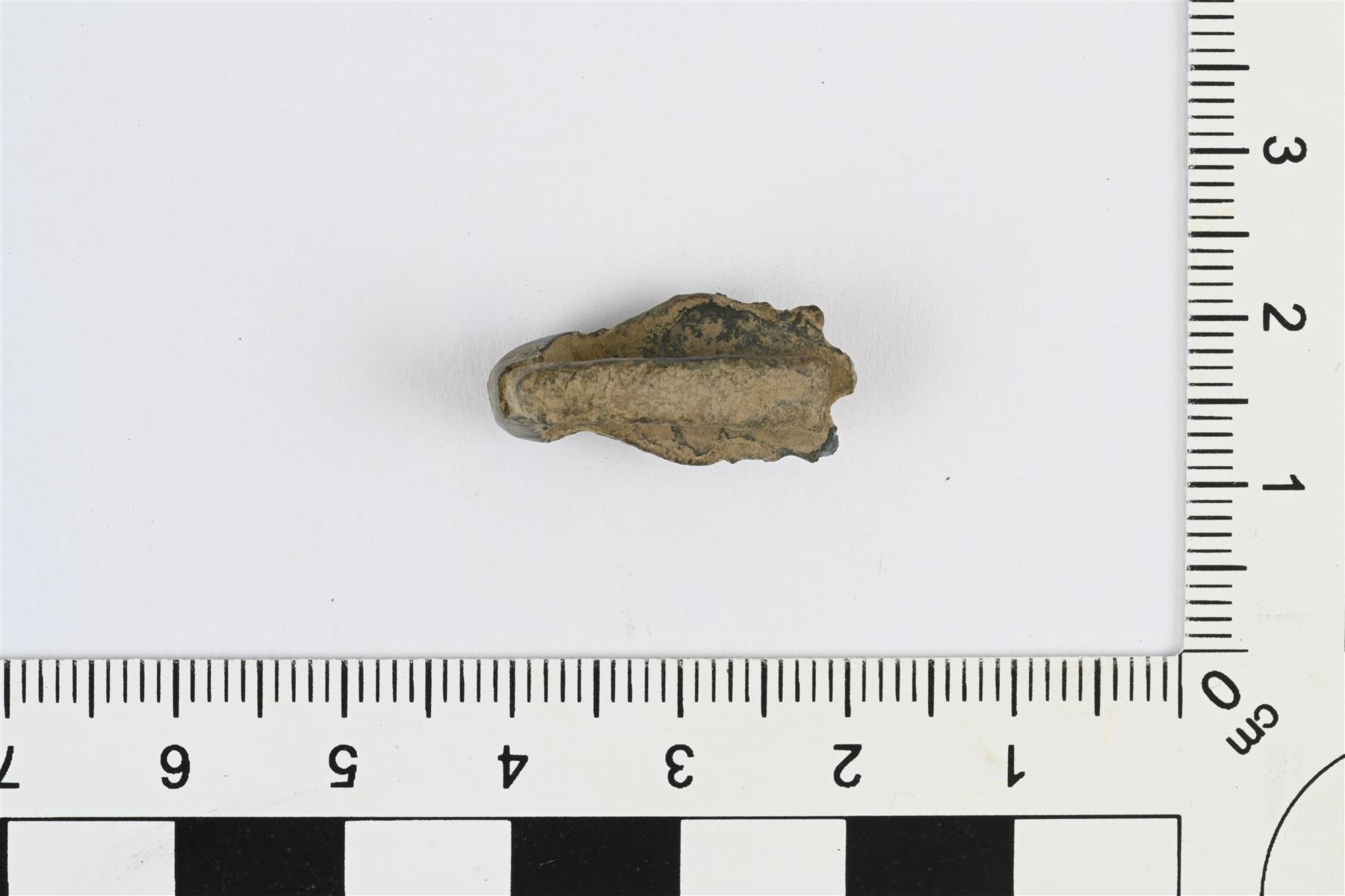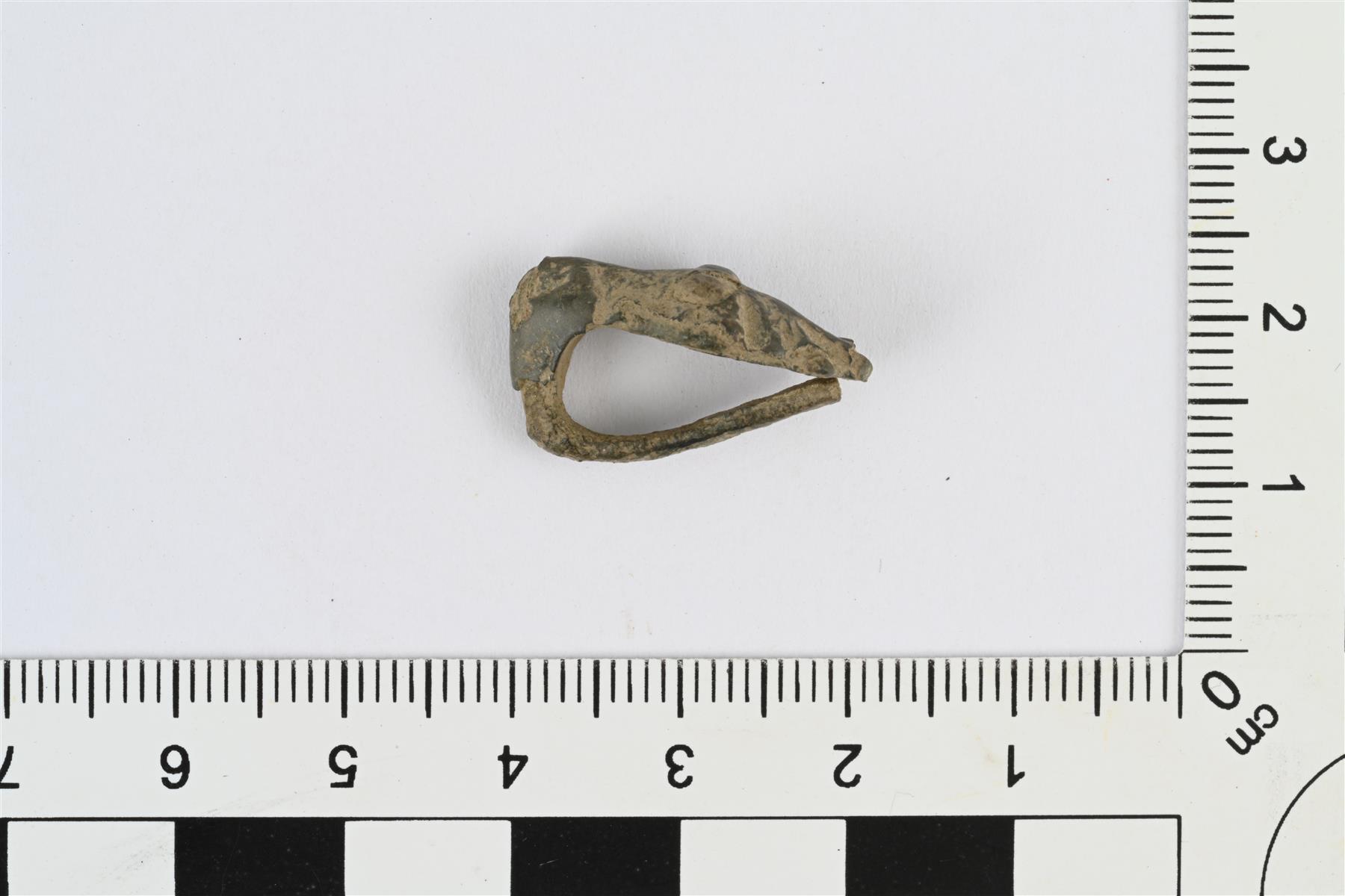 | Pieni eläinpäinen hihnanjakajan hela. Etupuolen varsi leveä ja reliefikoristeinen, taustapuolen varsi kapea ja koristelematon. | |
