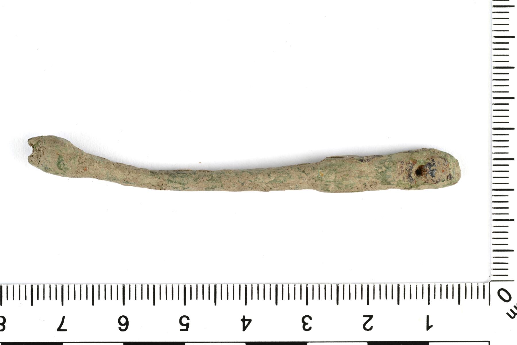 | Tasapainovaakaan kuuluvan poikittaisvarren katkelma. Keskellä ja päädyssä on reikä. Poikkileikkaus on pyöreähkö | |
