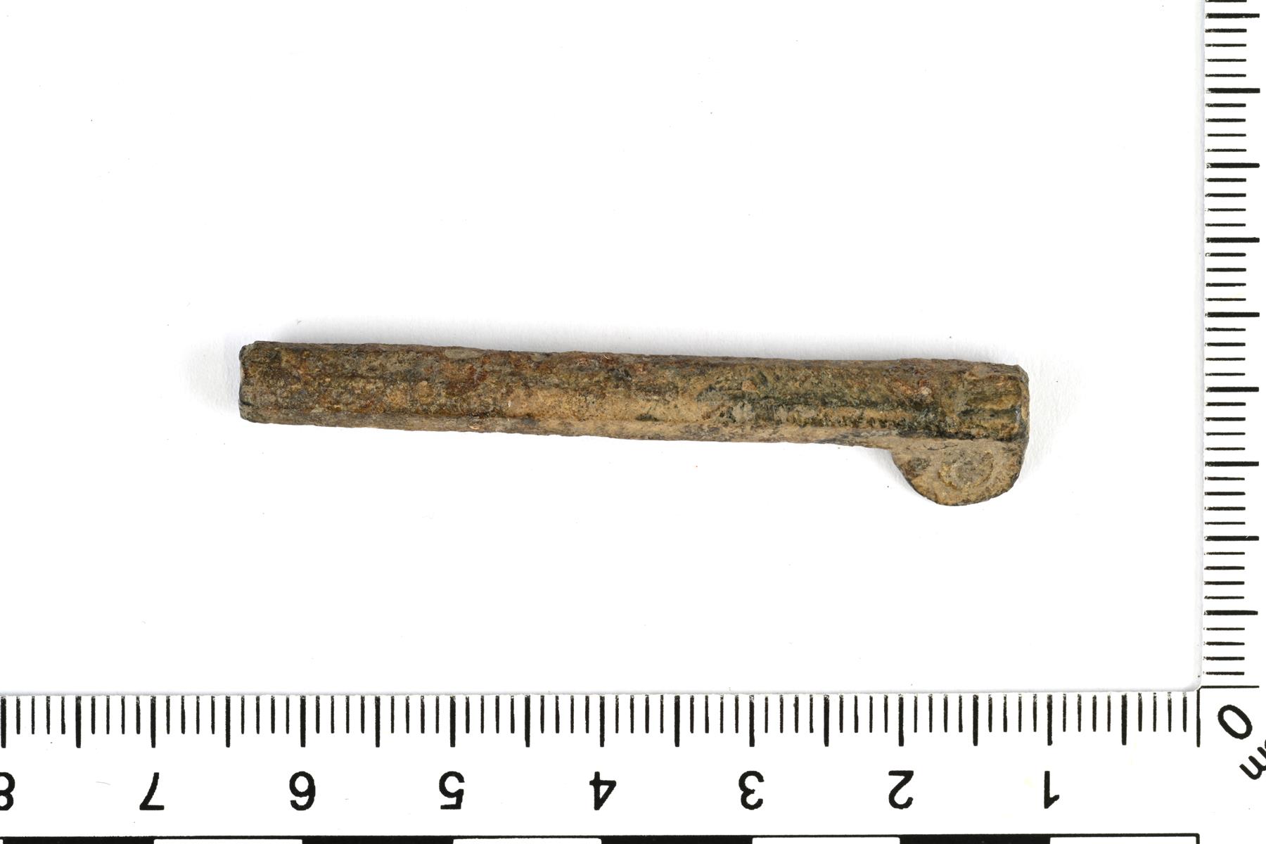 | Mahdollinen tasapainovaakaan kuuluneen poikittaisvarren katkelma. Päädyssä on puoliympyränmuotoinen levy, jossa on umpeen mennyt reikä. Poikkileikkaus on kahdeksankulmainen. | |