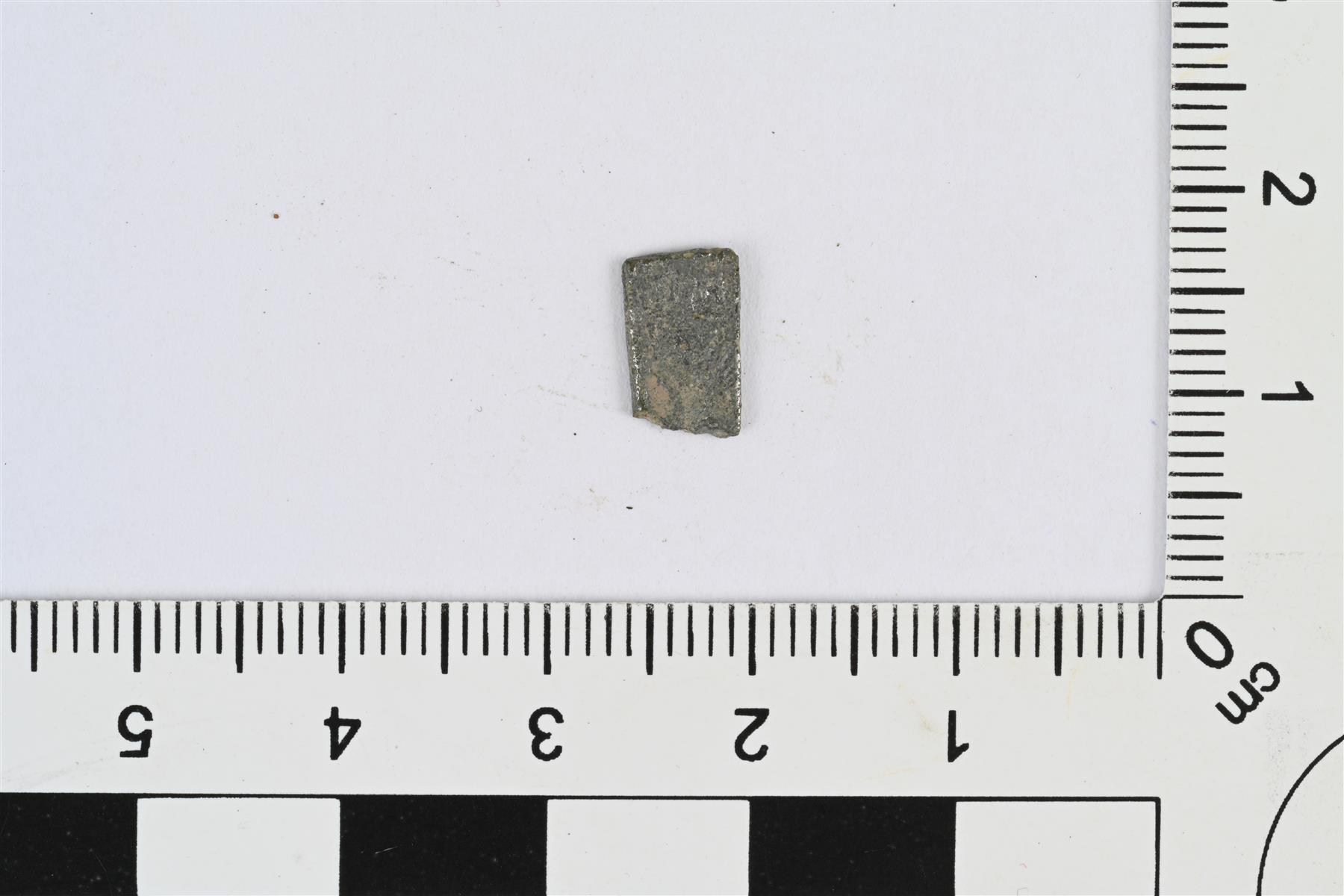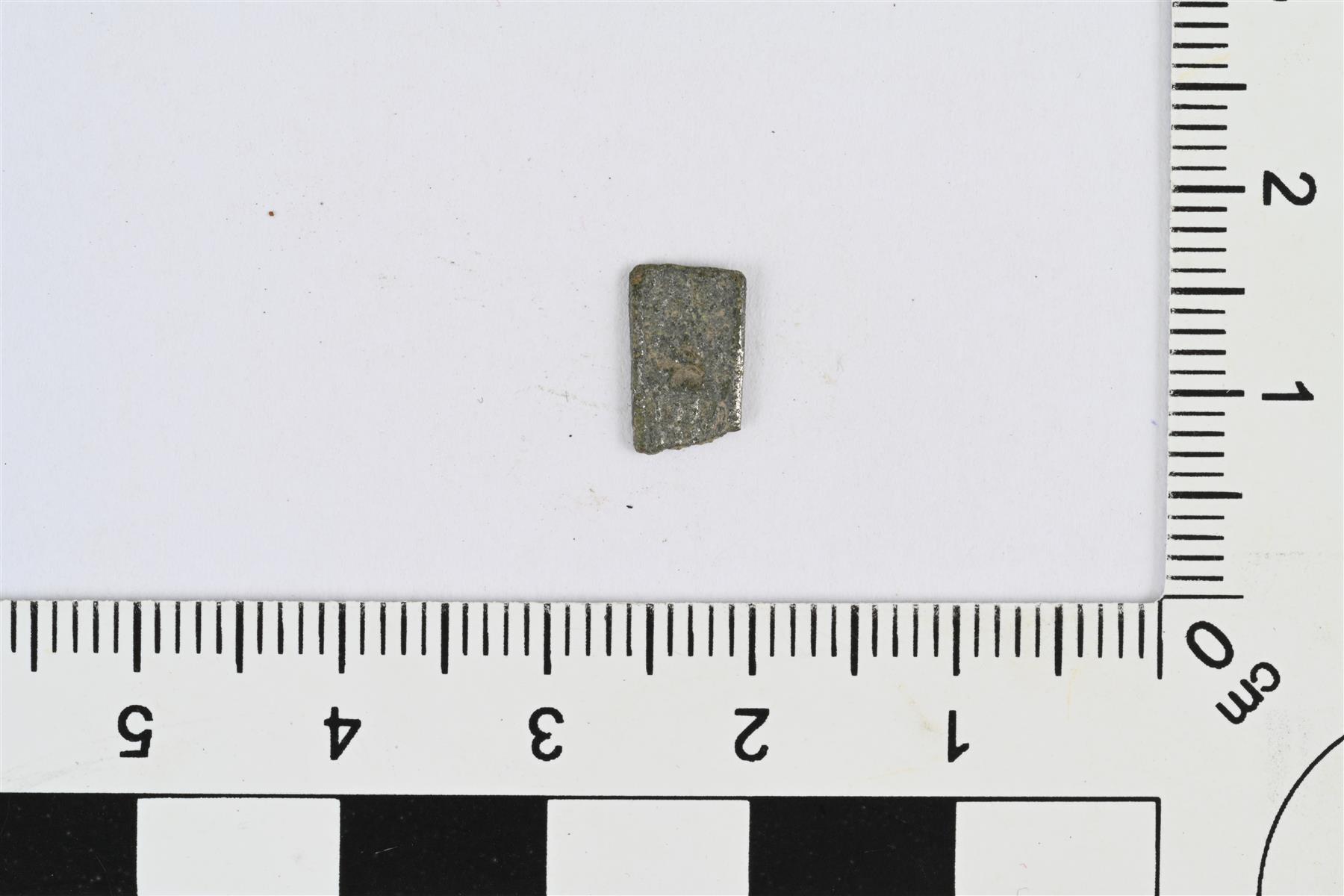 | Koristellun hopeaesineen katkelma. Mahdollisesti ristiriipuksen, ortodoksisen kasteristin katkelma. Litteä ja pitkänomainen suorakulmainen katkelma, jonka toinen pää ehjä. Molemmilla pinnoilla heikosti erottuvaa reliefikoristelua. | |