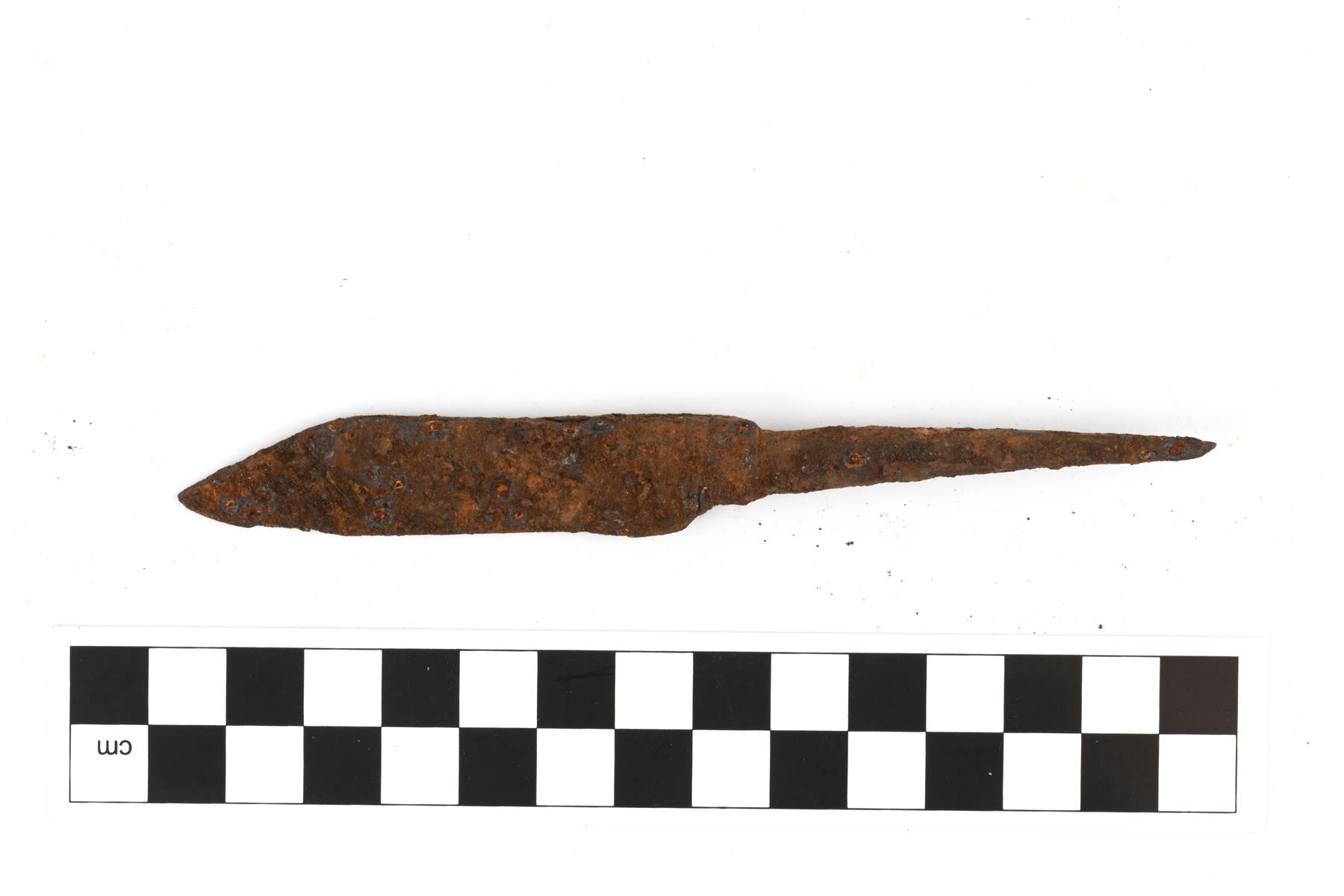 | Veitsen terä ja kahvaruoto. Terä on suorahamarainen ja sisältää jyrkän kärkitaitteen. Ruodon ja veitsen hamaran välillä on pieni porras. Terän ja ruodon välissä on poikkileikkaukseltaan neliömäinen kaula. Terän poikkileikkaus kolmiomainen (viisteetön). | |