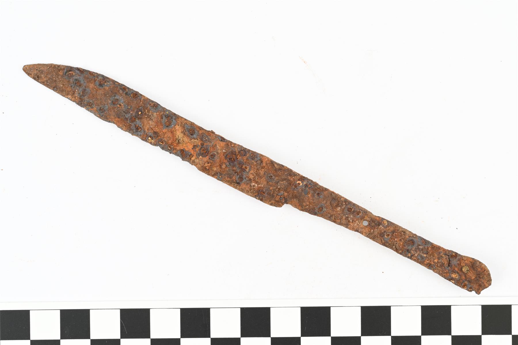 | Pöytäveitsen terä ja ruoto. Kahvaruodon lappeiden helat puuttuvat, mutta kahvaruodossa on paikoillaan yhden kupariseosniitin varsi. Lisäksi kaksi tyhjää niitinreikää.