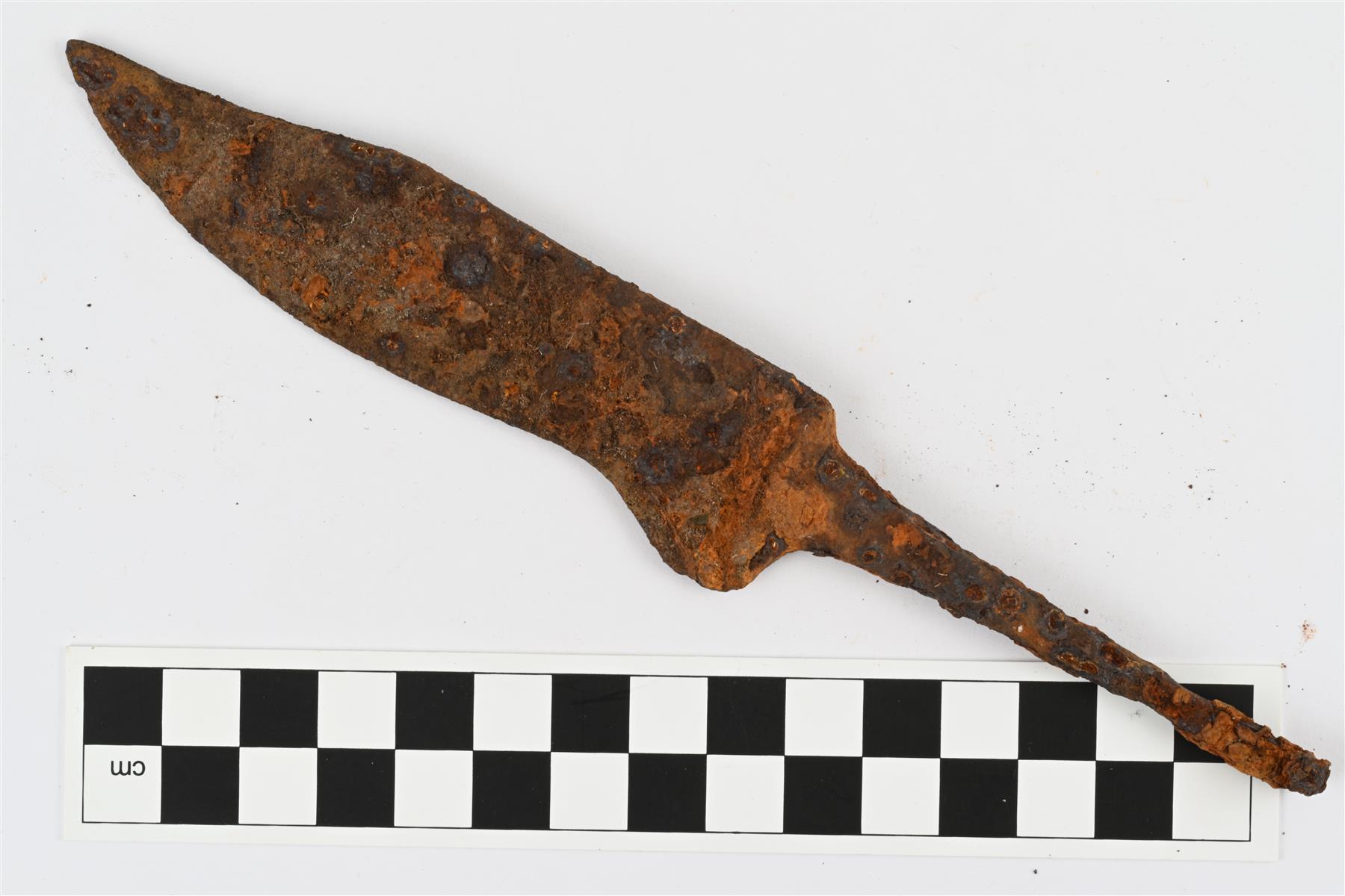 | Iso veitsi. Leveässä terässä suora hamara ja pitkä, kovera kärkitaite noin 2/5 terän pituudelta. Teränsuussa ruodonpuoleisessa puolikkaassa voimakkaan kovera muoto. Ruoto on kotkattu kahvan kannasta nähden vasemmalle sivulle. Terän poikkileikkaus kolmiomainen (viisteetön). | |