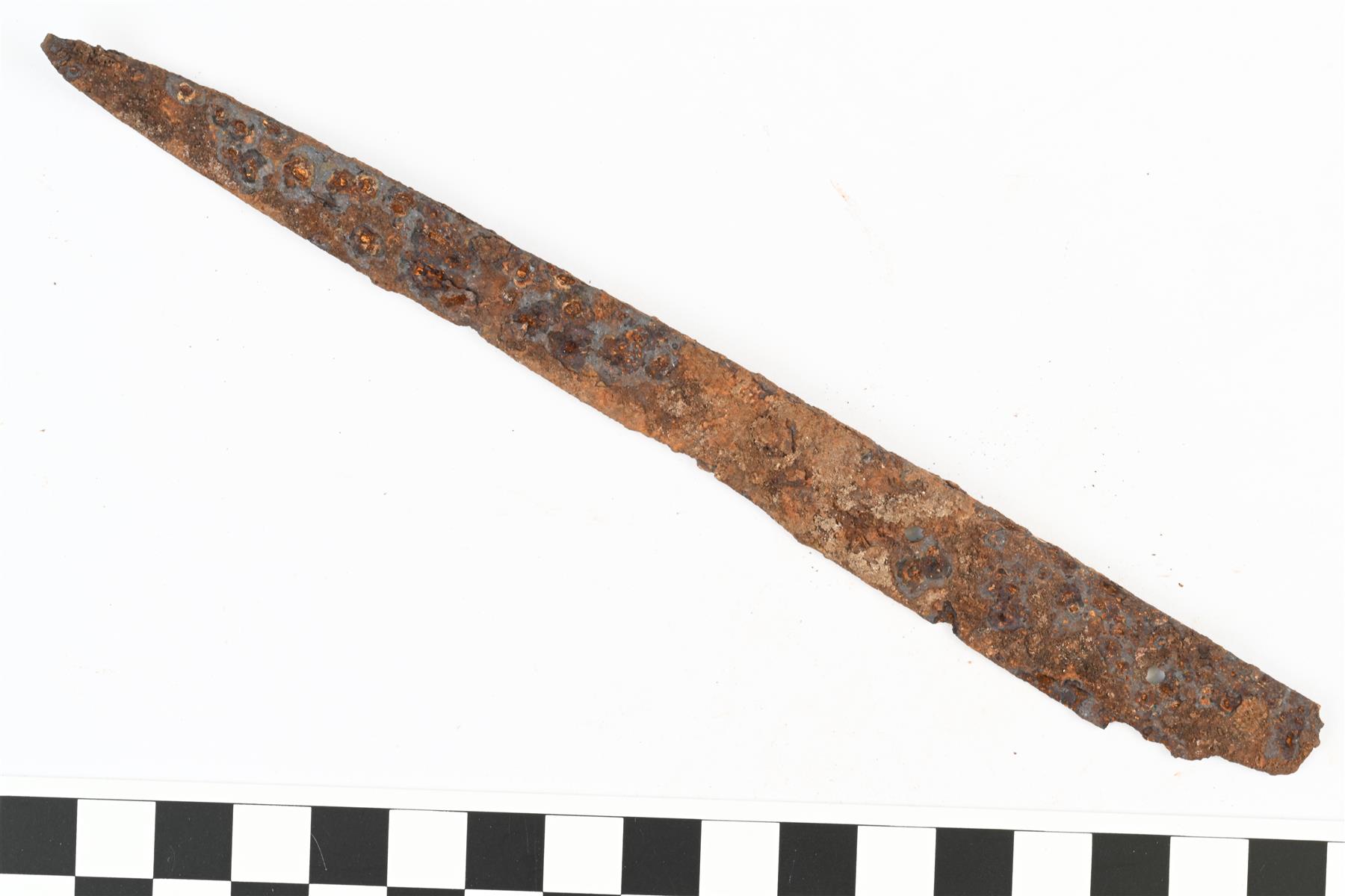 | Kapeateräinen ja leveäruotoinen pöytäveitsi. Ruodon yläsivu samalla tasalla terän hamaran kanssa. Ruodon alasivu hieman teränsuuta alempana. Ruodossa kaksi niitinreikää. Kahvaheloista ei jälkiä. Terä kapenee ja ohenee kärkeä kohti. | |