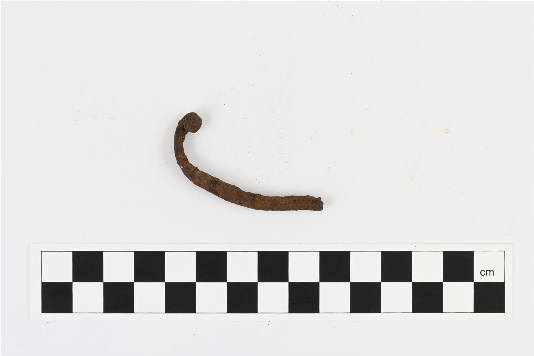 | Katkelma taipunutta, poikkileikkaukseltaan nelikulmaista rautavarrasta, jonka pää on taivutettu rullaksi. Saattaisi olla rautaisen rullapäisen hevosenkenkäsoljen katkelma (muunnos B), mutta voi myös olla jotain muuta. | |
