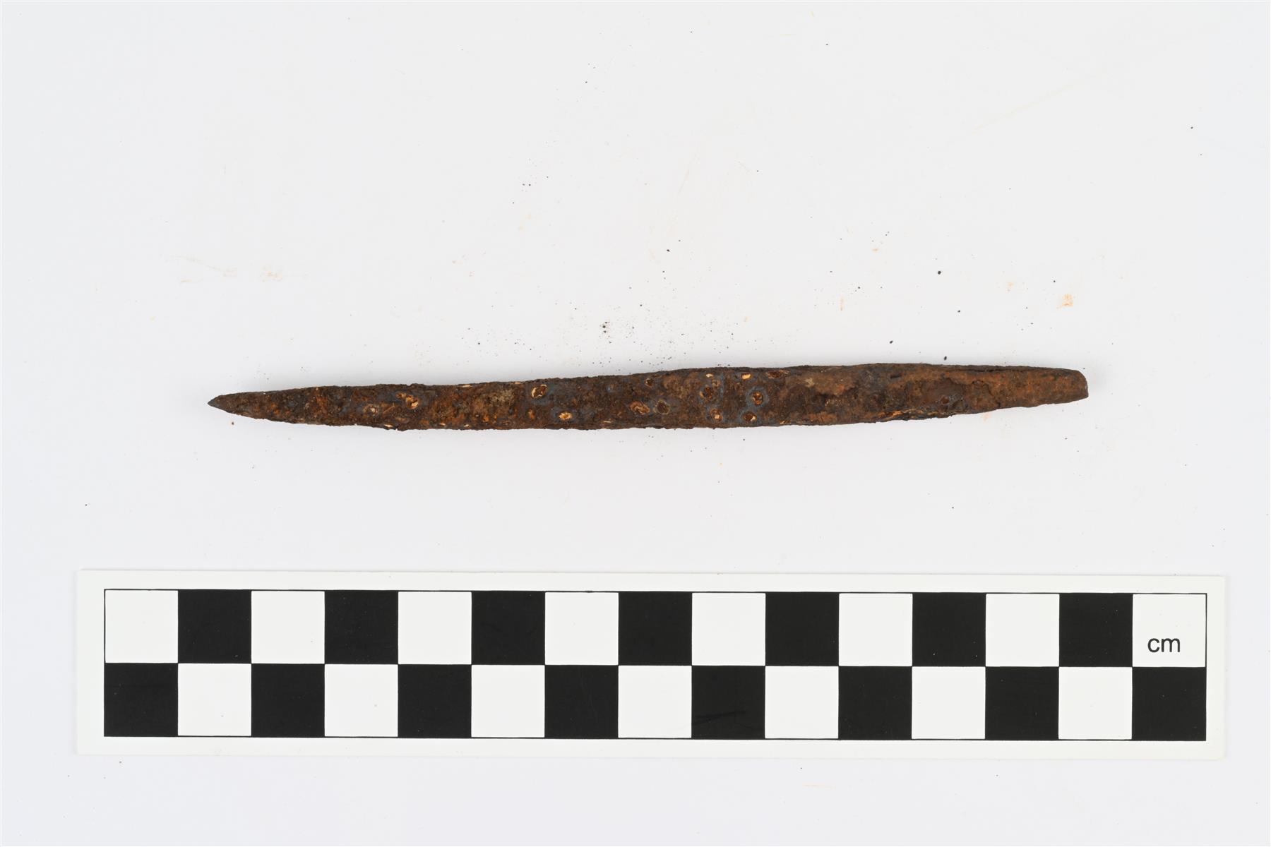 | Rautainen naskali tai sellaista muistuttava esine. Piikkimäisen osan poikkileikkaus neliömäinen. Esineen toisessa päässä litistetty, poikkileikkaukseltaan suorakaiteinen ruoto | |