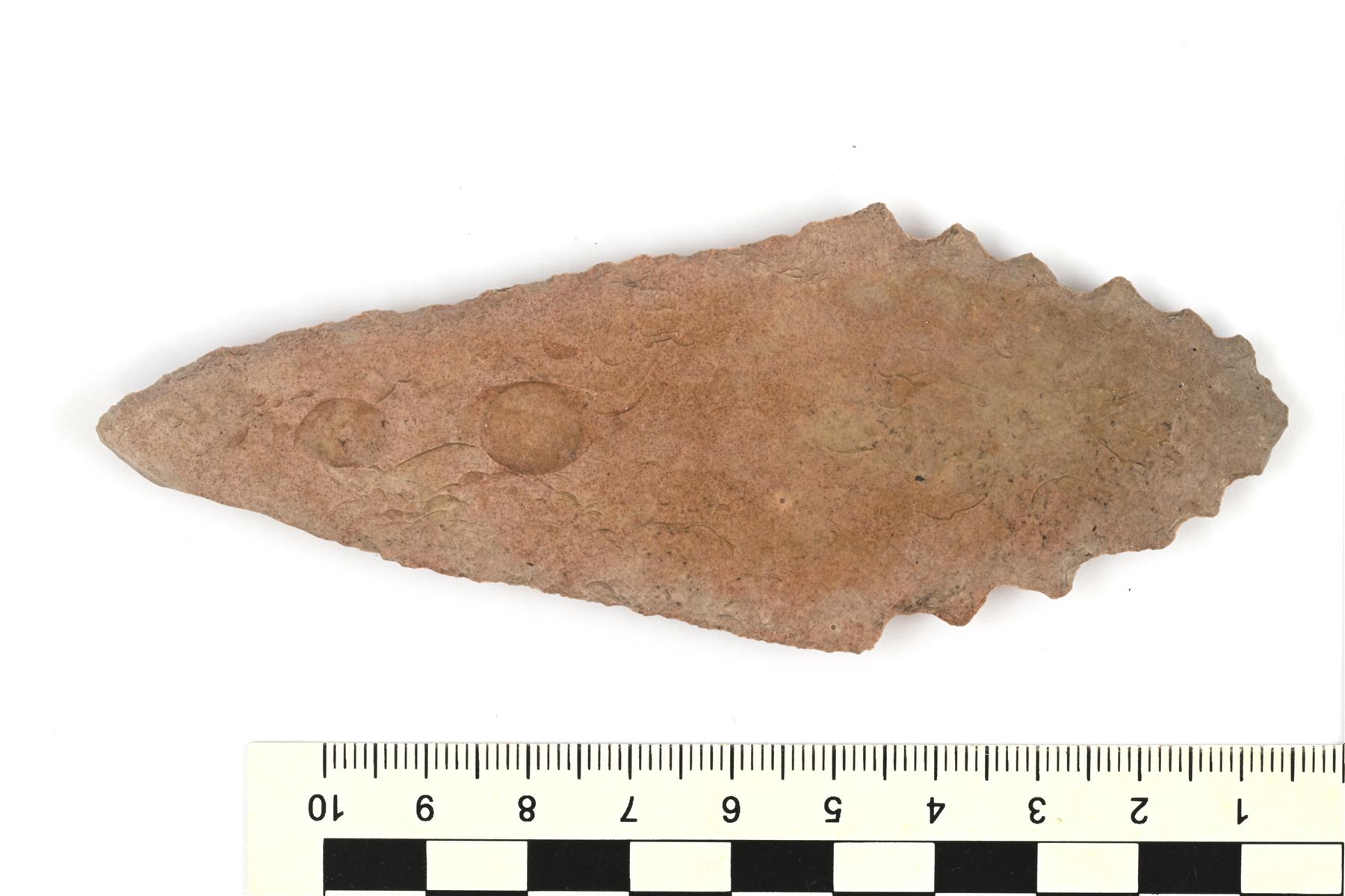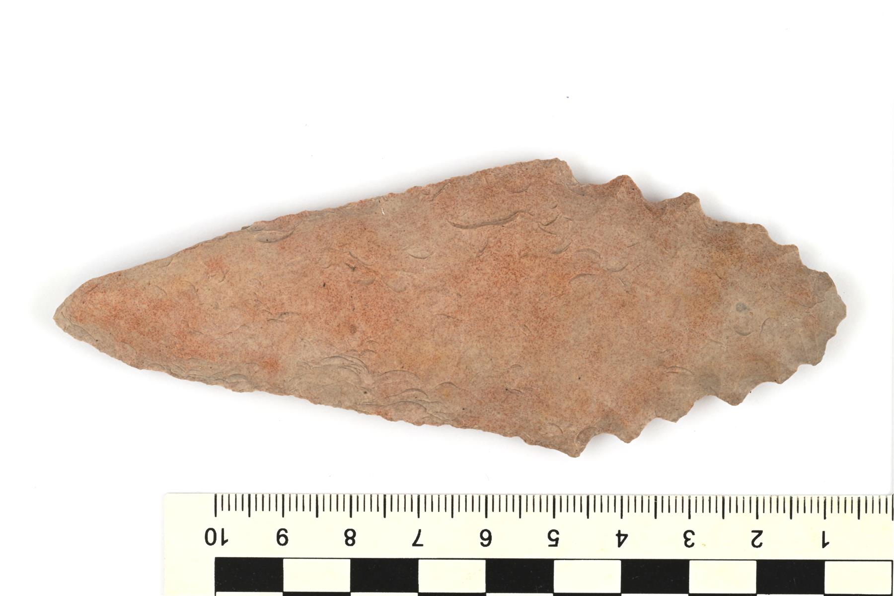 | Punertavanharmaasta piikivestä tehty keihäänkärki. Kaksiteräinen ja poikkileikkaukseltaan linssimäinen. Teränsuut on työstetty kummaltakin puolelta. Keihään alaosassa on selkeämpiä työstöjälkiä, jotka ovat jättäneet reunat sahalaitaisiksi. | |