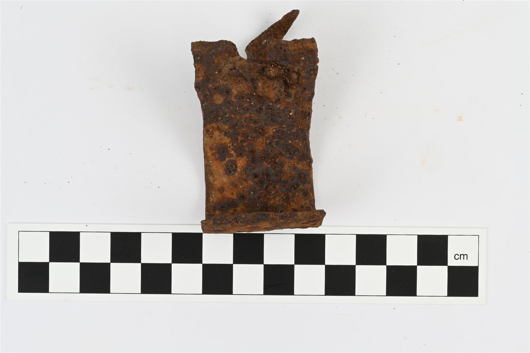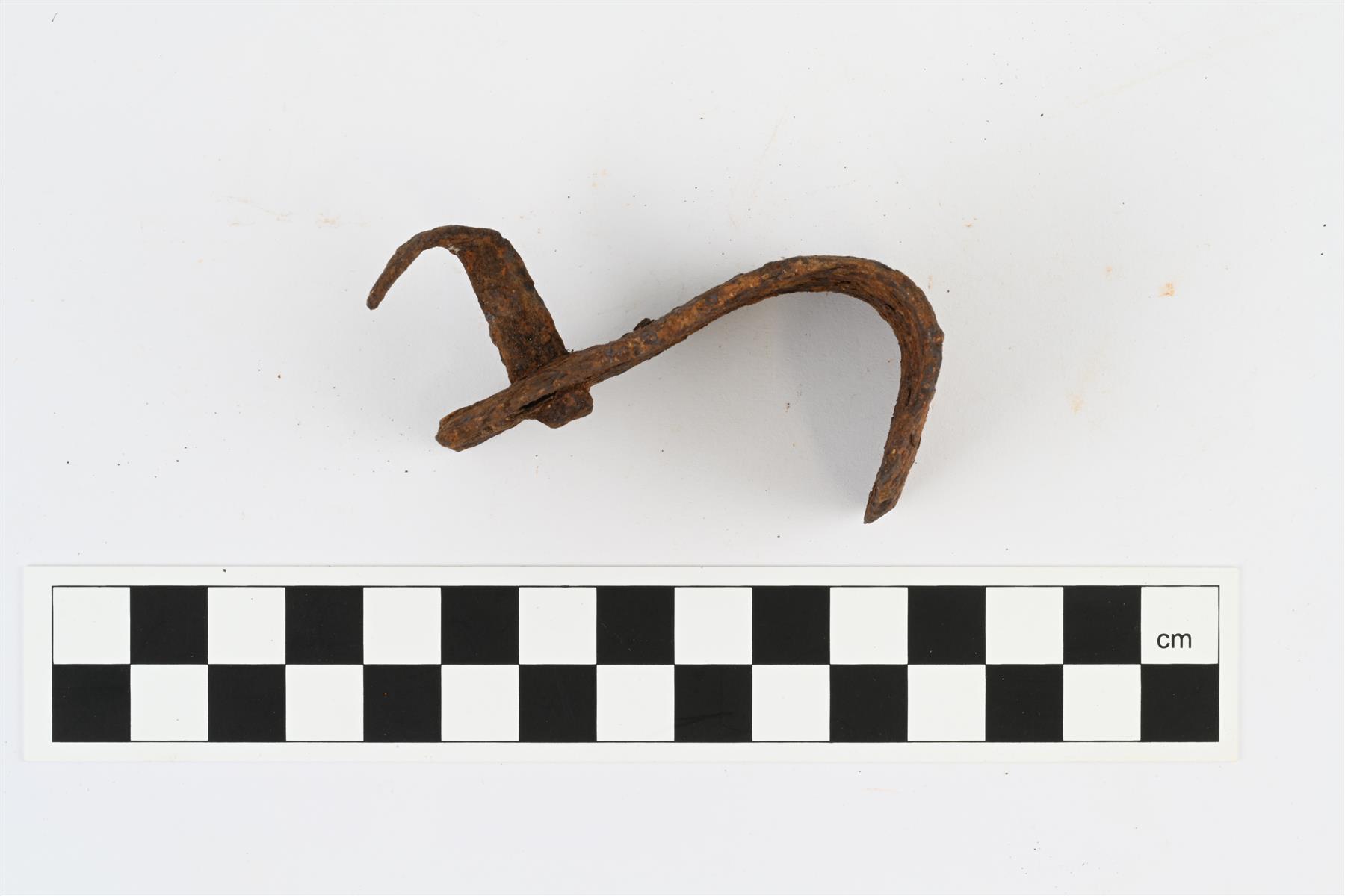| Tasasivuinen litteähkö rauta, sivusta katsoen J-kirjaimen muotoinen. Toisessa päässä terä, toisessa murtopinta. Murtopinnan vierellä kiinni iso kotkattu takonaula, joka on lyöty esineessä olevasta reiästä läpi. Esine on ilmeisesti puolikas jiekiön eli näskäysraudan S-muotoisesta terästä, joka on naulalla ollut kiinni puukapulassa. | |