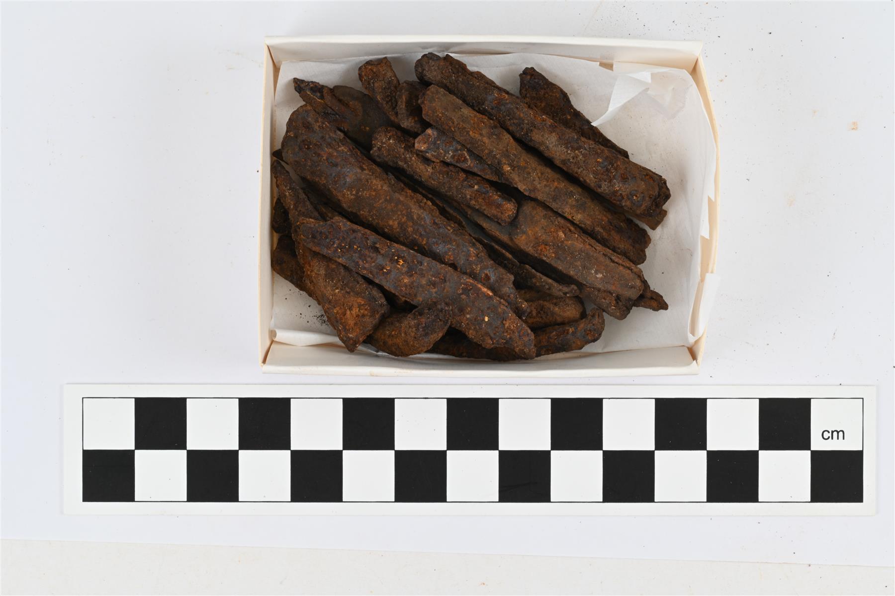 | Pitkänomaisia tunnistamattomia taottujen rautaesineiden katkelmia. Enimmäkseen varrasmaisia. | |