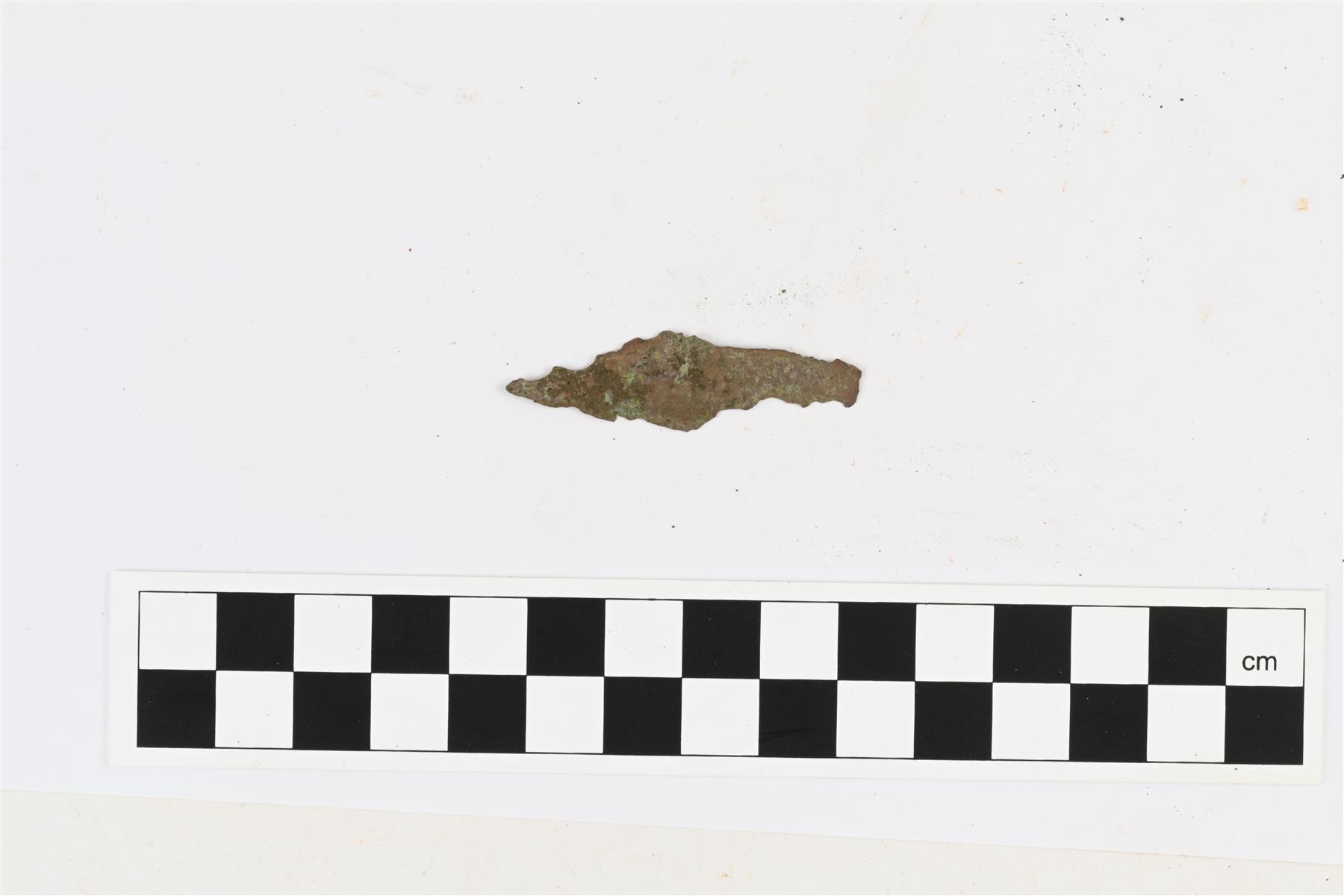 | Paksusta kuparipellistä nuolenkärkimäiseen muotoon leikattu kappale. Ruodollinen. | |