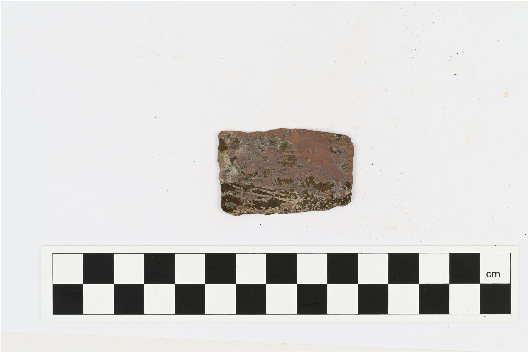 | Suorakaiteenmuotoinen kuparipeltikappale, kulmissa puhkaistut niittausreät. Ehkä kattilan paikka. | |