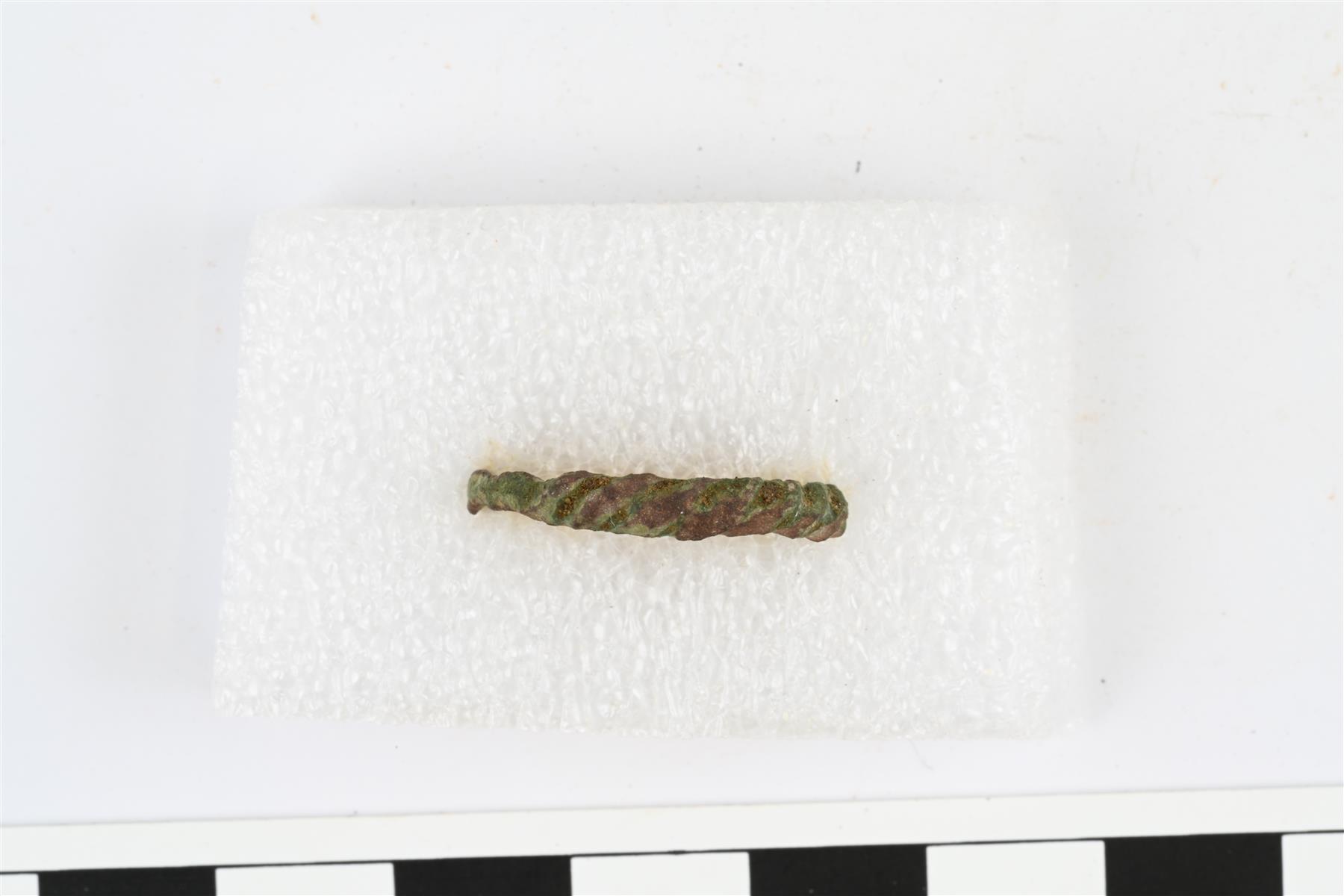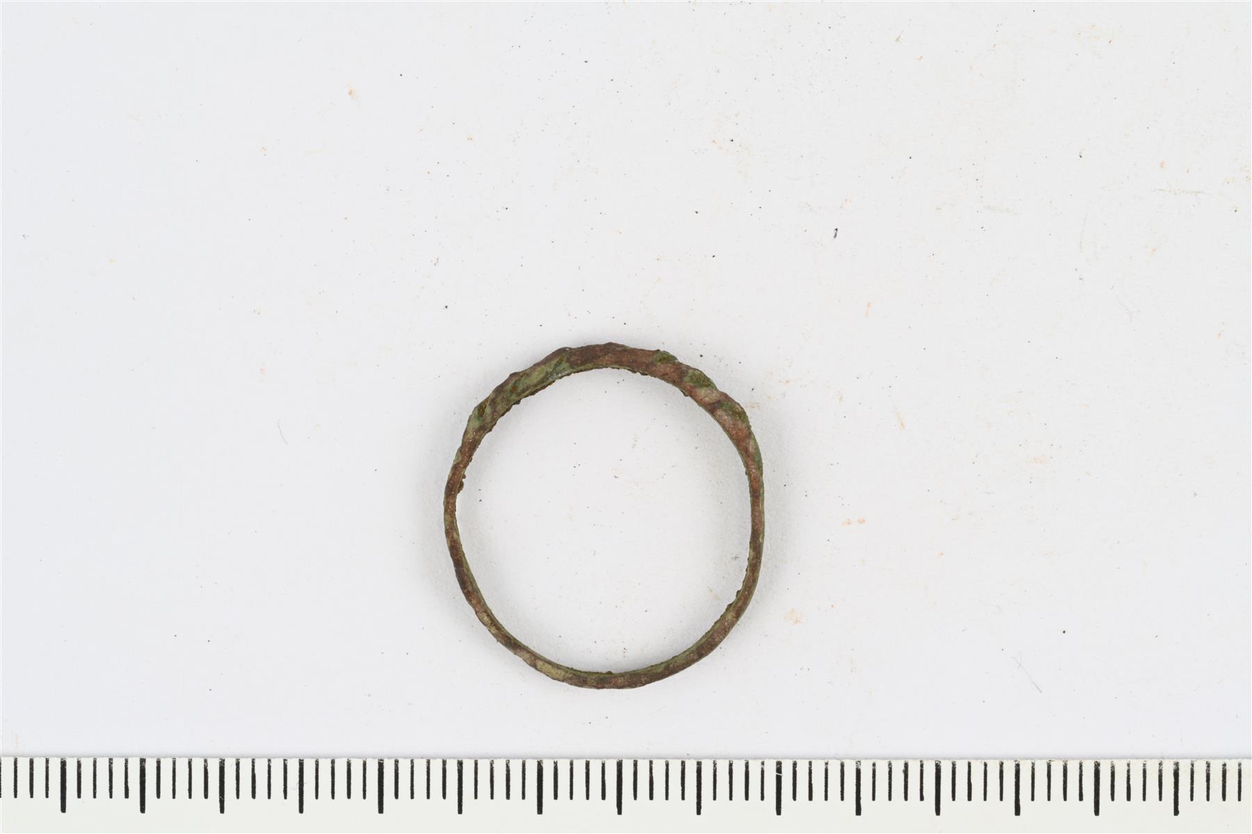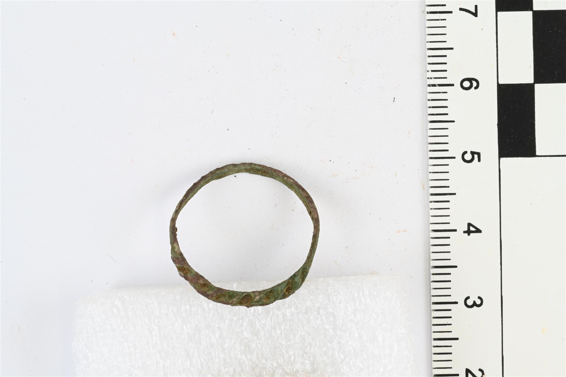 | Kupariseoksinen siro sormus, jonka kehä paksunee ja levenee hieman etuosassa. Paksunnoksessa on vinouurteista koostuvaa koristelua ("pseudotordeeraus"). Muistuttaa Virossa 1200- ja 1300-luvuille ajoitettuja sormuksia. Läheinen vastine sisältyy ruotsalaiseen Rautasjauren löytöön, joka on ajoitettu 1000 - 1200-luvulle. | |