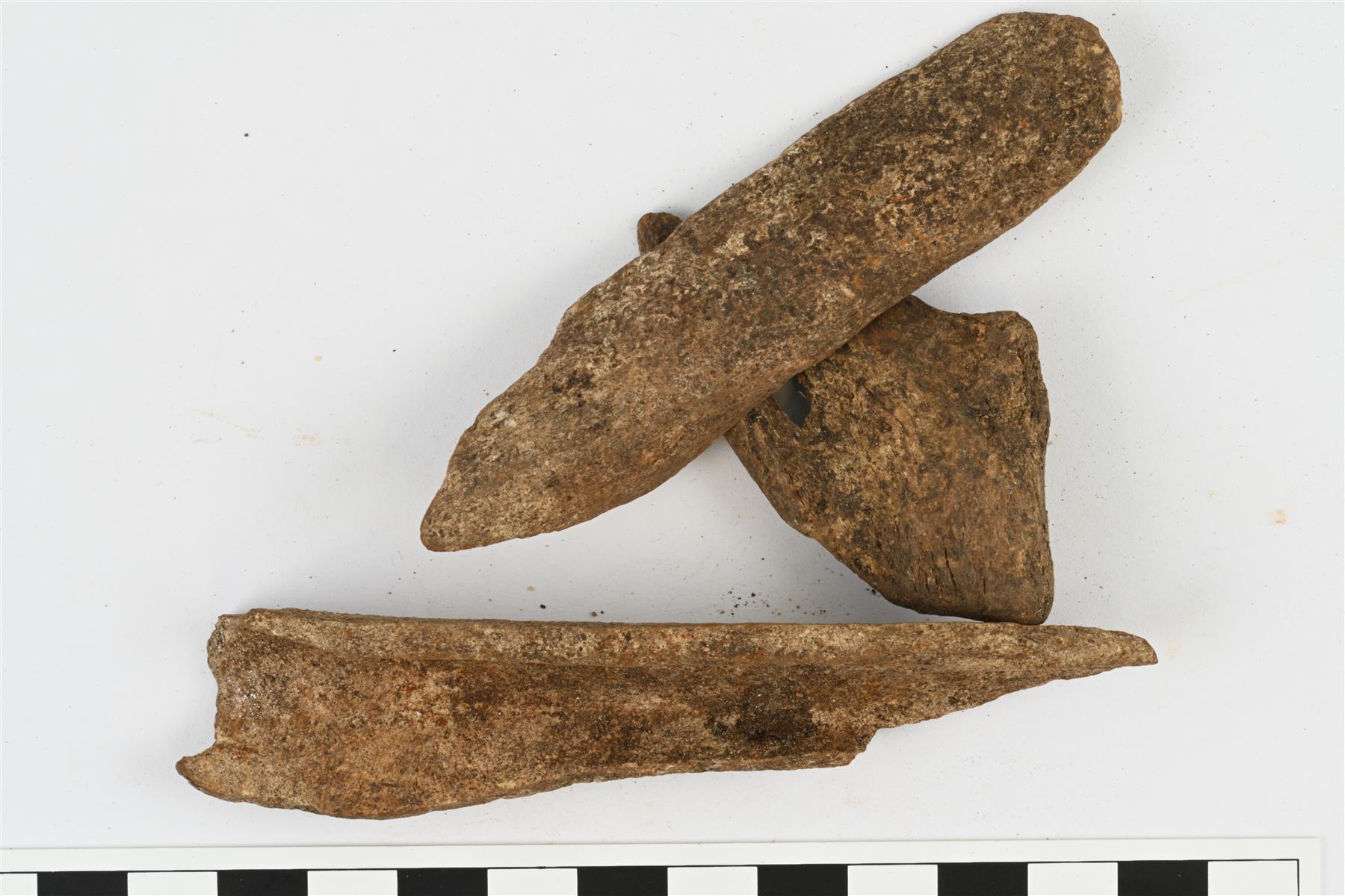 | Kolme rikottua ison nisäkkään (poron?) luuta. | |
