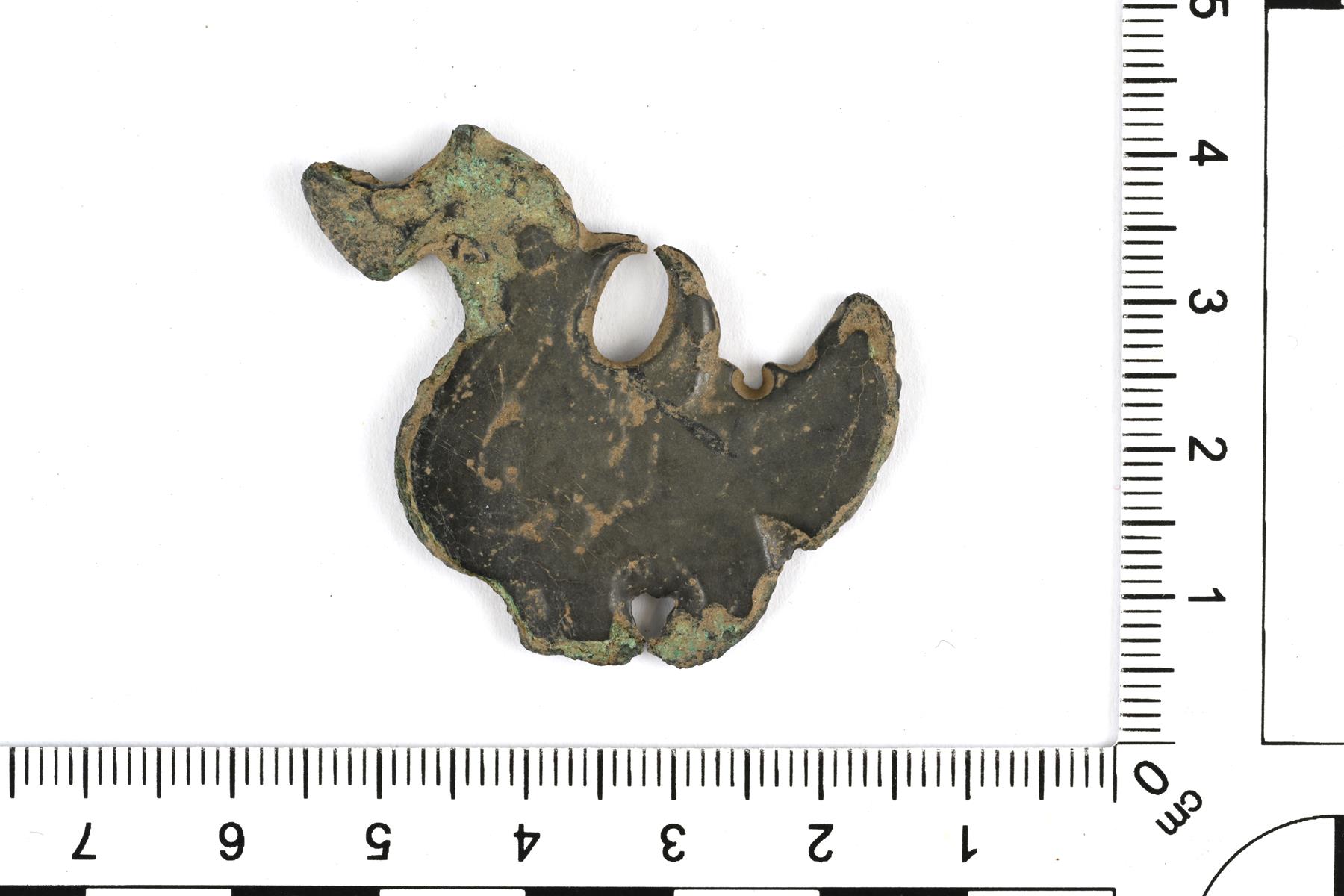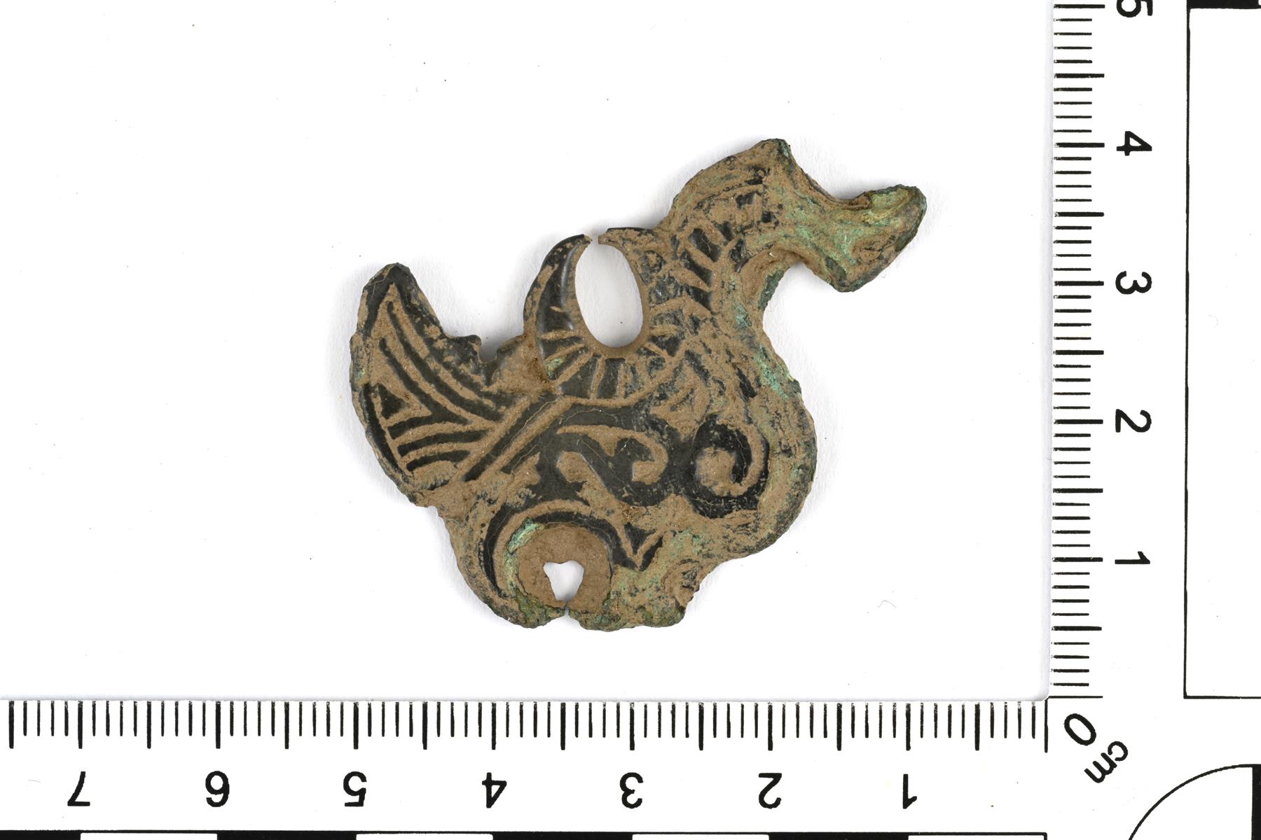 | Melkein kokonaisena säilynyt linturiipus. Ylä- ja alaosan ripustuslenkit ovat hajonneet. Koristeluna yksinkertaista viiva- ja nauhaornamentiikkaa. Sivuilla erottuu valinsauman jäänne. | |