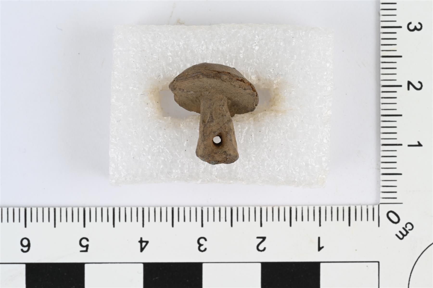 | Nappi, luultavasti lyijyä tai tina-lyijyseosta. Puolipallon muotoinen nappi, jonka taustapuolella melko pitkä tappimainen kanta, kannan alaosassa pieni reikä. | |