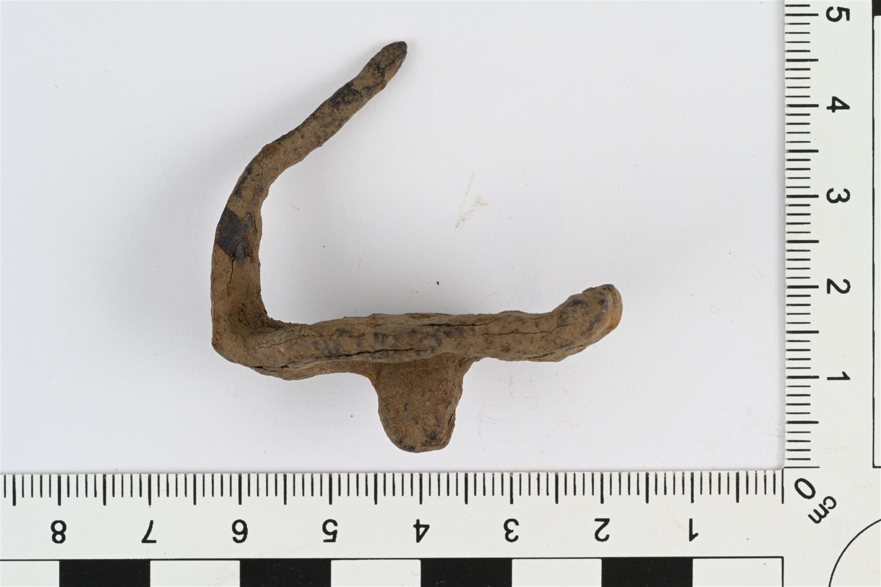 | Kaksipiikkinen hevosen viskari. Soikea levy, jonka keskellä toisella puolella kohoava ja suippeneva jäänasta. Levyn toisella puolella sen päissä ohuet taipuvat varret, joista toinen katkennut lähes juuresta. Vrt. Kivikoski 1973, Taf. 110, Abb. 996. | |