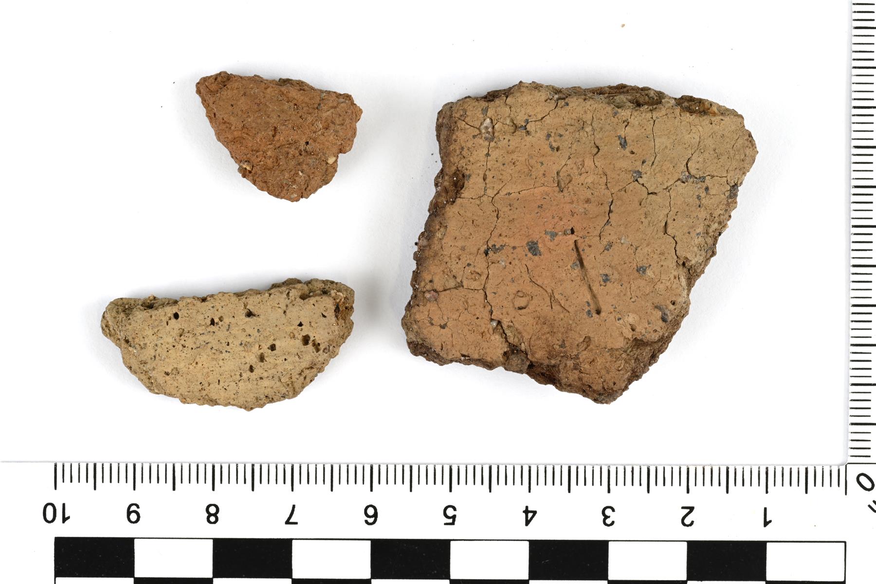 | Koristelemattoman keraamisen astian seinäpaloja. Ulkopinta on sileä, sisäpinta on yhdessä palassa sileä ja toisessa karkea. Väritys on kauttaaltaan ruskea. Sekoitteena maasälpää. | |