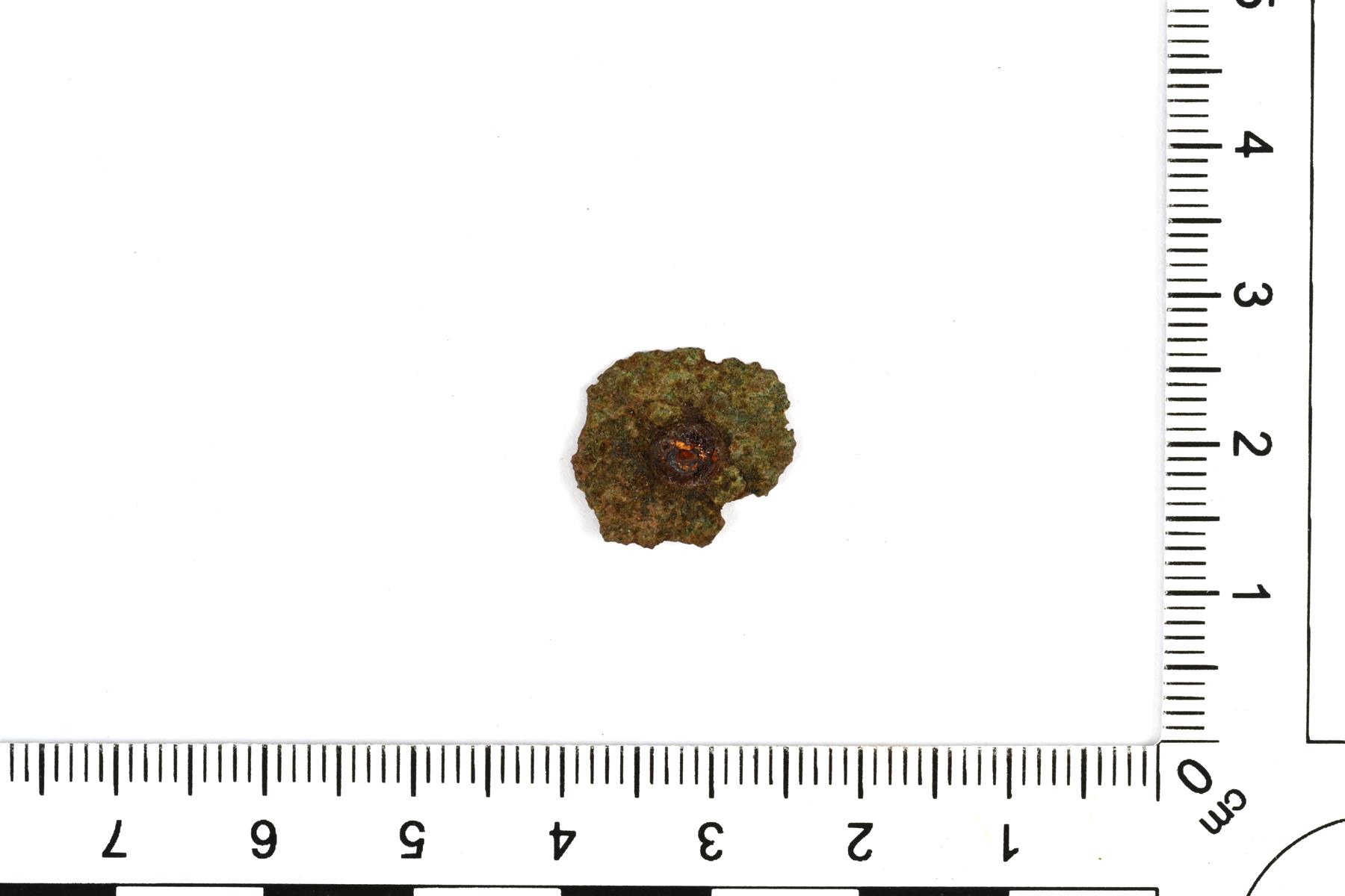 | Pieni kupariseospellin katkelma. Keskellä on reikä ja jäänne rautaisesta niitistä. | |
