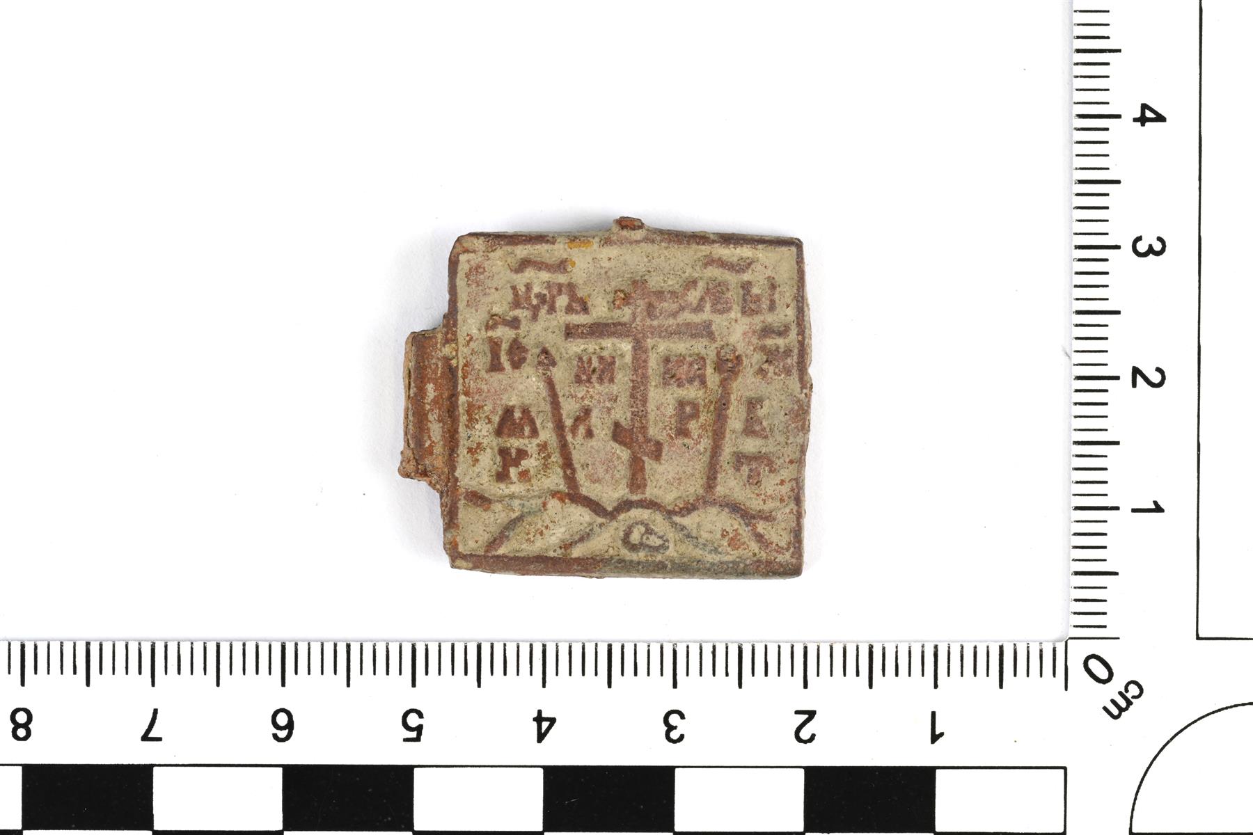 | Matkaikonin katkelma. Ripustuslenkki ja ovi puuttuvat. Ikonissa on kuvattuna keskellä Maria ja Jeesus. Kummassakin alakulmassa on pyhimykset. Taustapuolella on kuvattuna ortodoksiristi ja kyrillistä kirjoitusta. Pinta on melko huonokuntoinen. | |