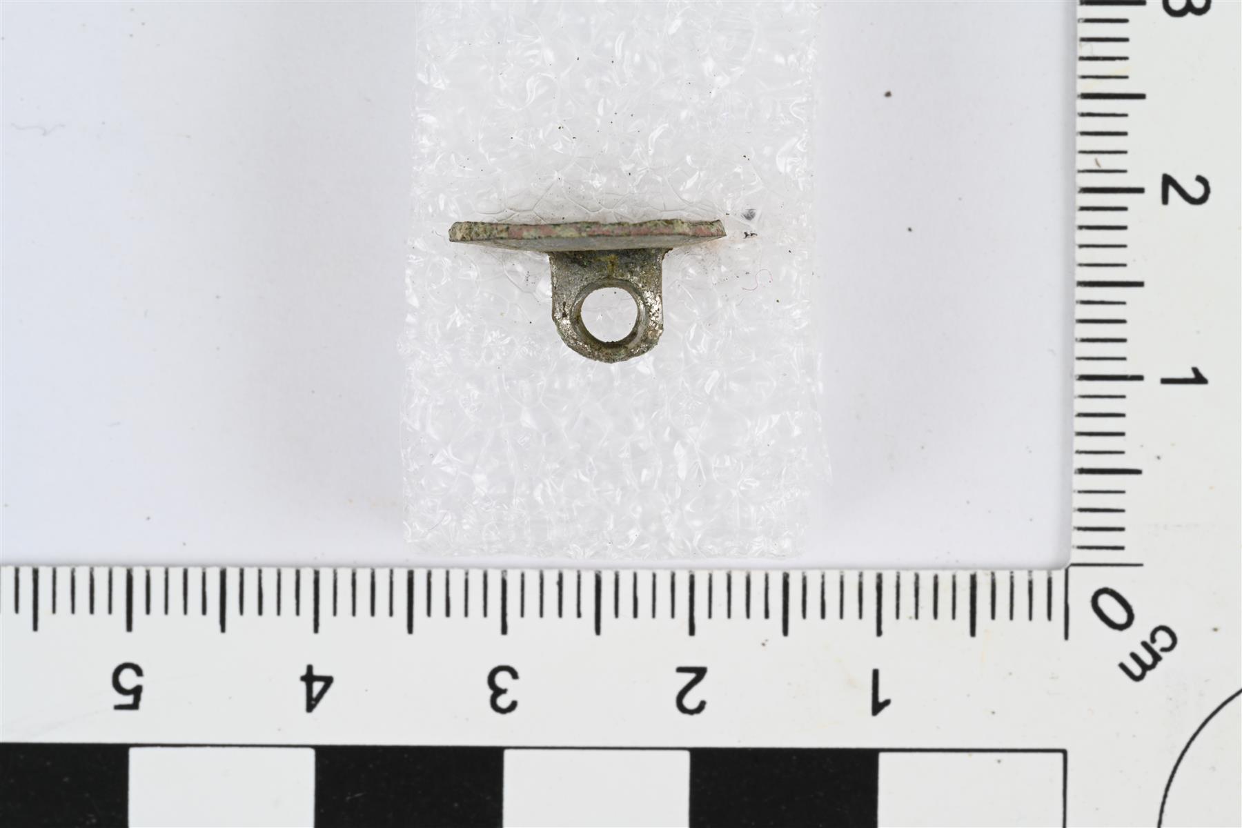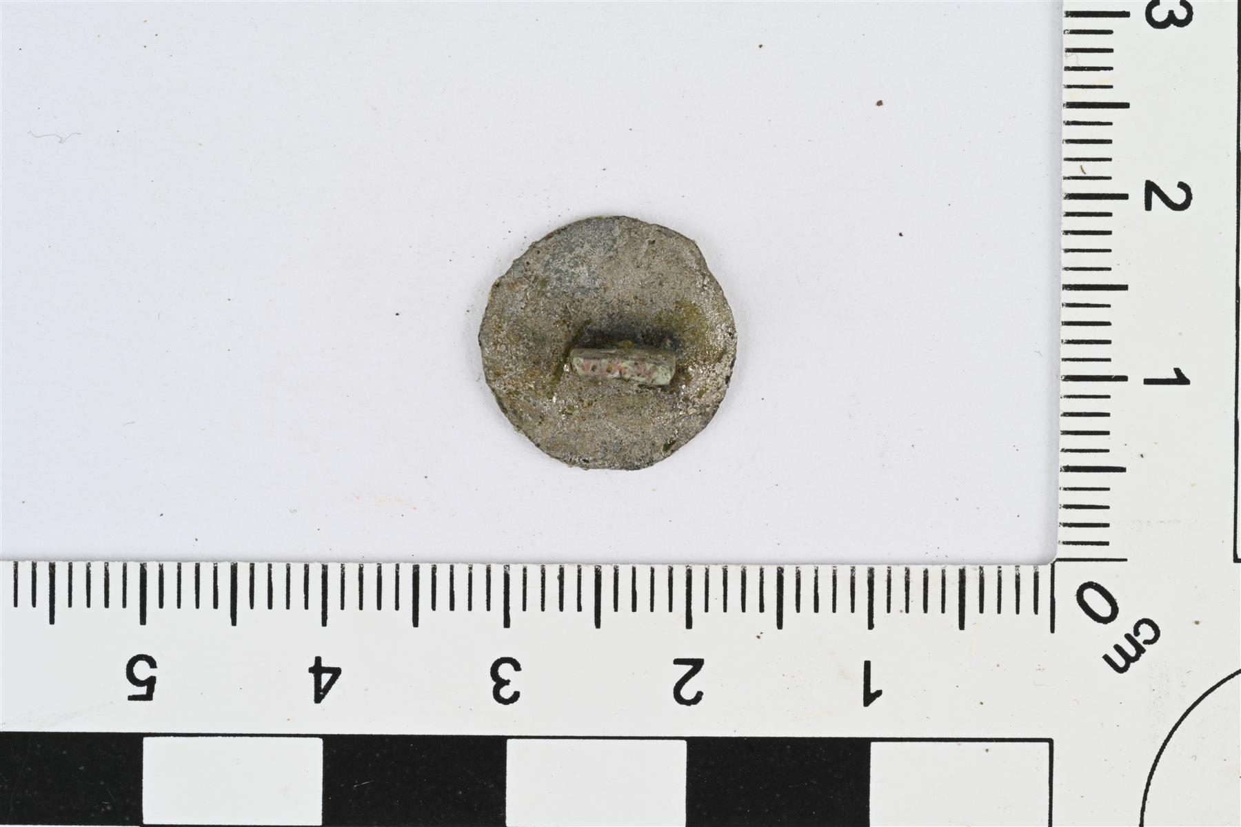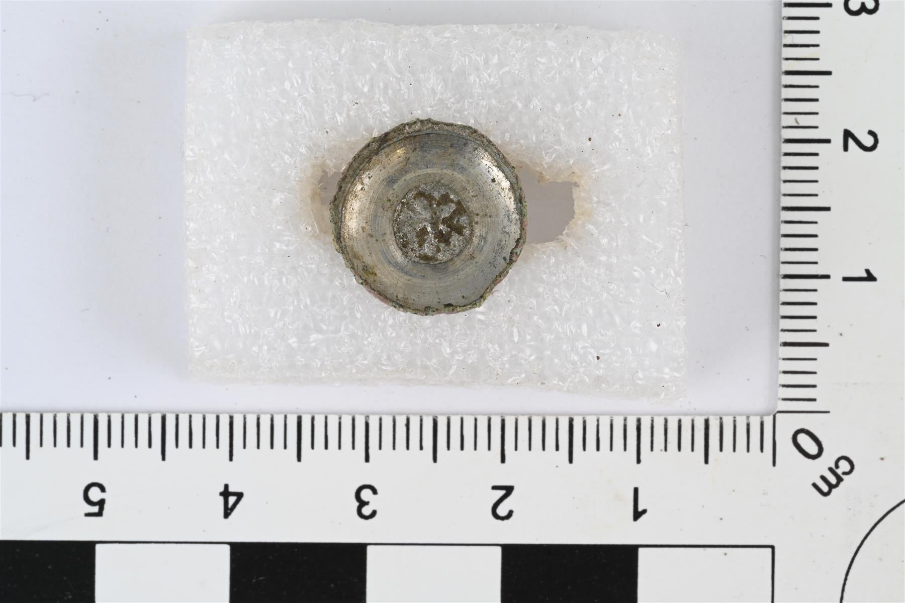 | Koristeltu nappi, ns. kansanpuvun nappi. Hopeaa tai hopeoitua kupariseosta. Levymäinen, etupuolelta hieman kovera. Etupuolella keskellä reliefikoristeluna kukkakuvio. Taustapuolella kanta. Reuna murtunut. | |