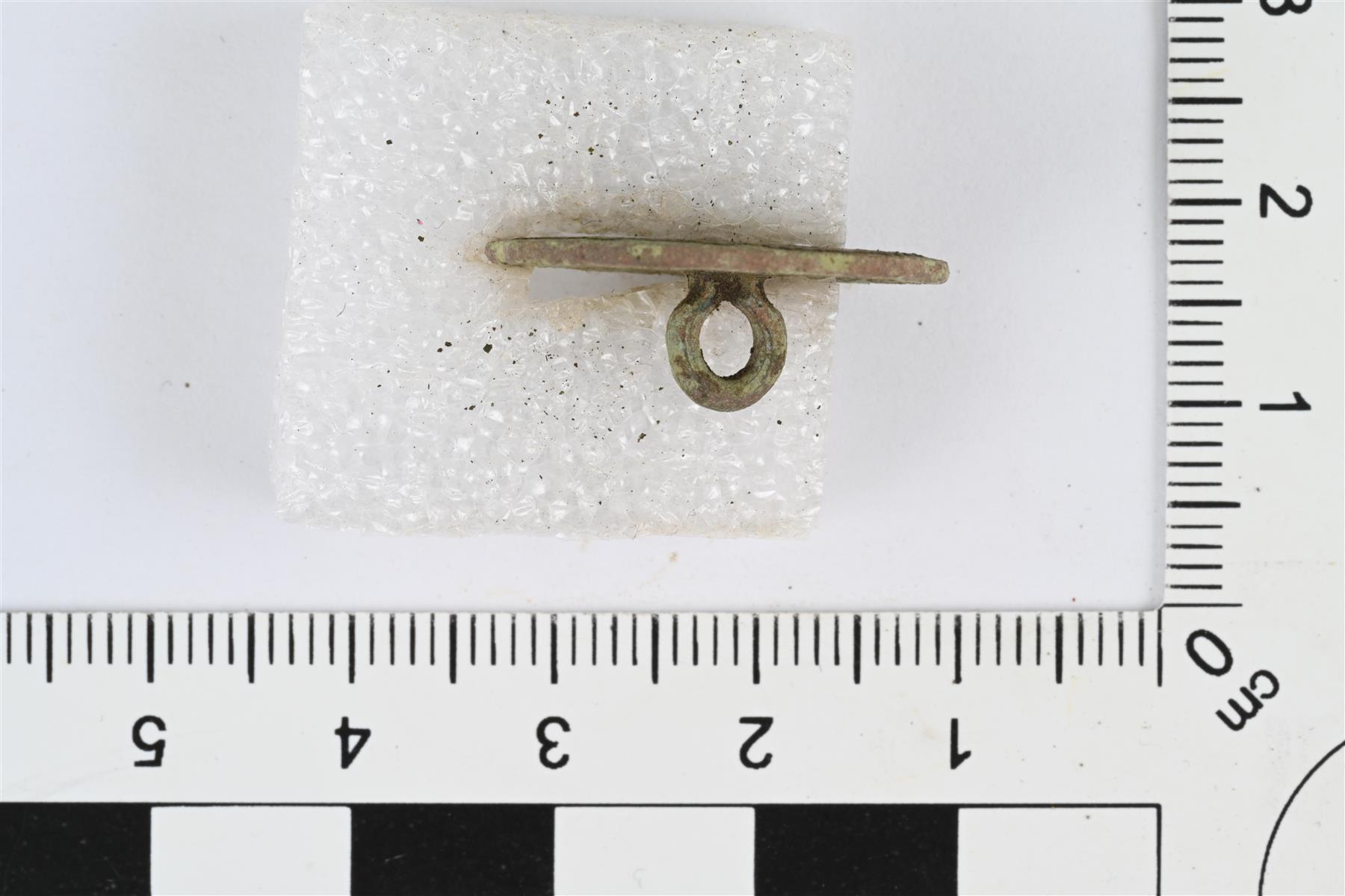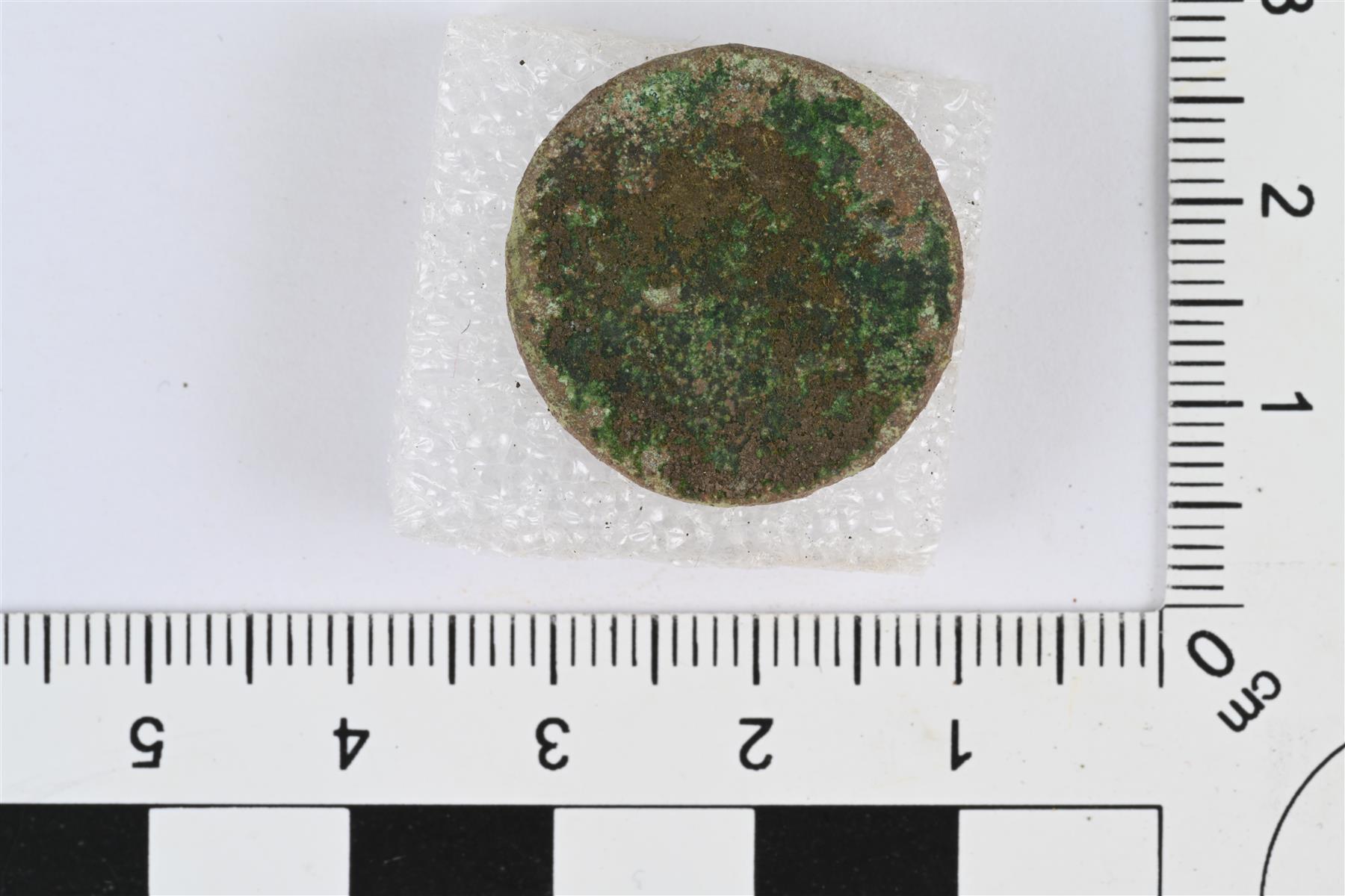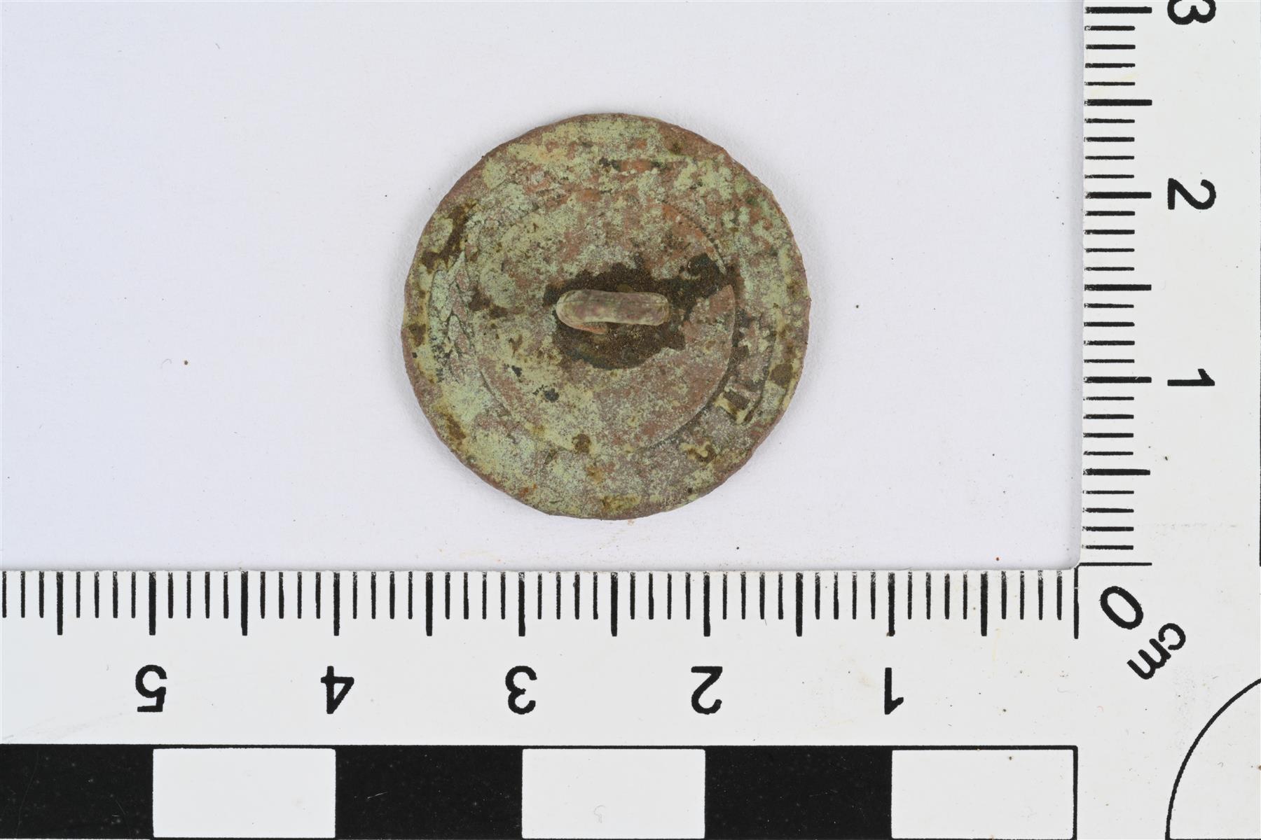 | Levymäinen nappi. Taustapuolella lenkkimäinen kanta. Taustapuolella myös mahdollinen valmistajan merkki, reunan ja kannan välissä kuviokehä, jossa erottuu nuolikuvioita, tähti ja mahdollisesti kyrillisiä kirjaimia. Merkintä on samanlainen kuin napeissa KM 46000:5,7,9,11-13. | |