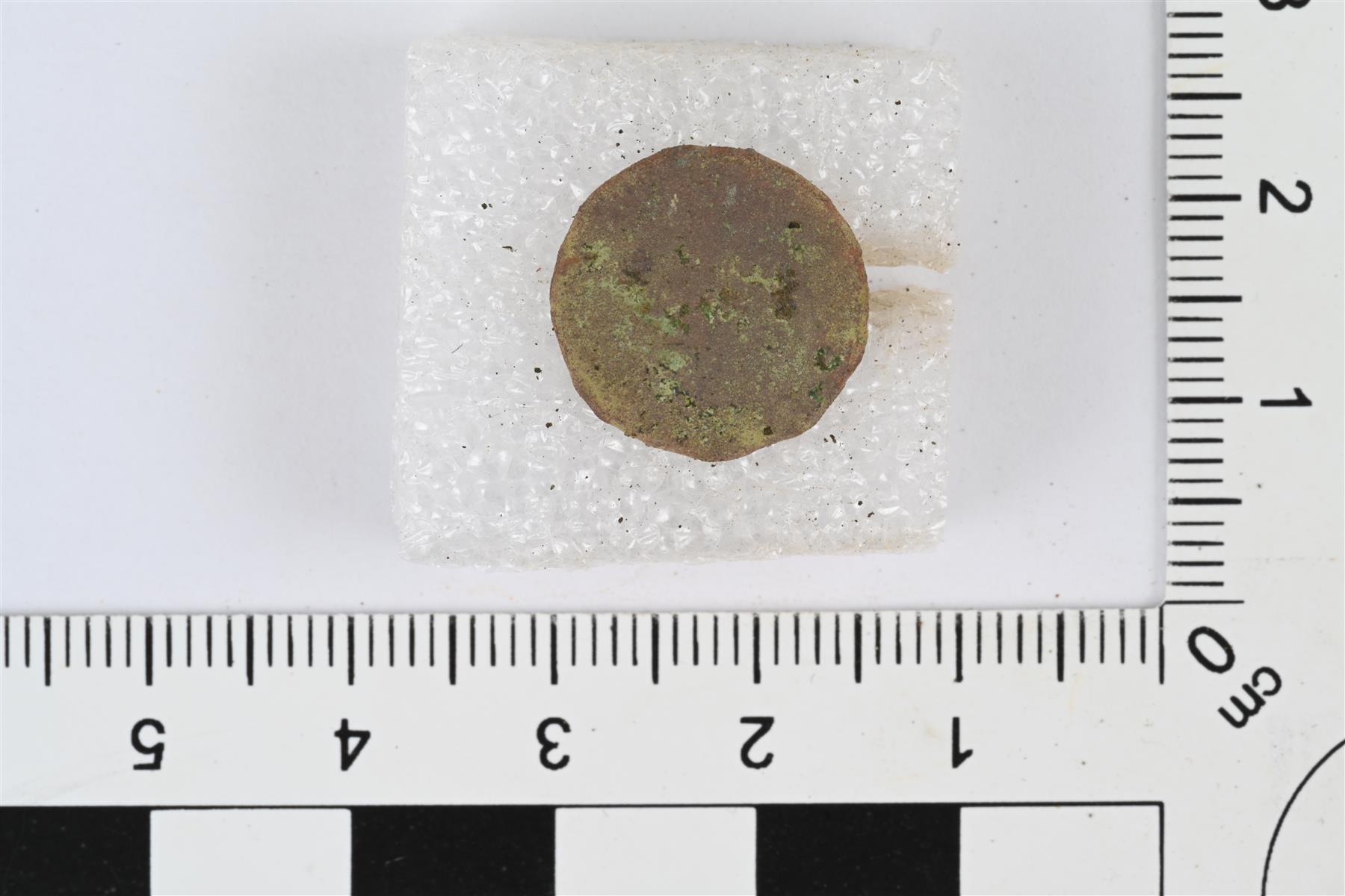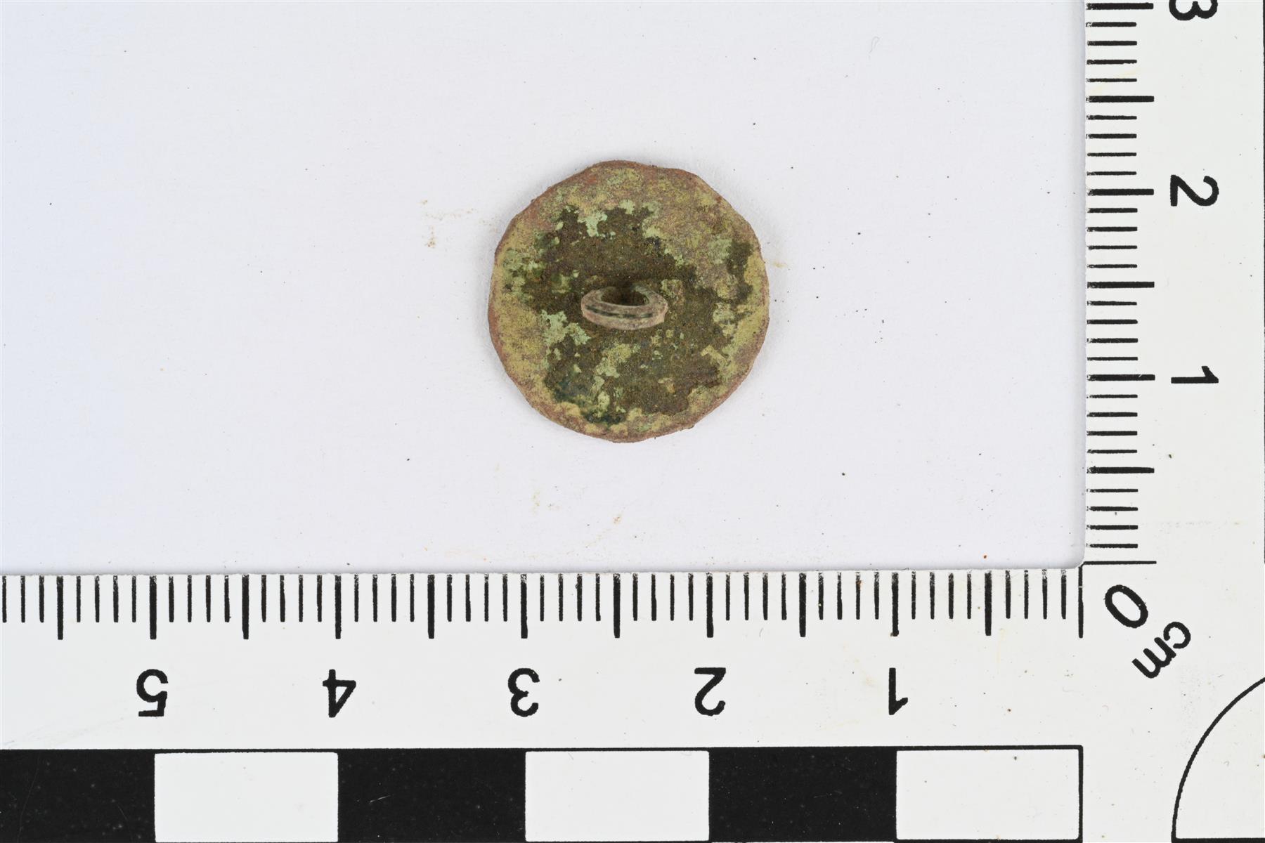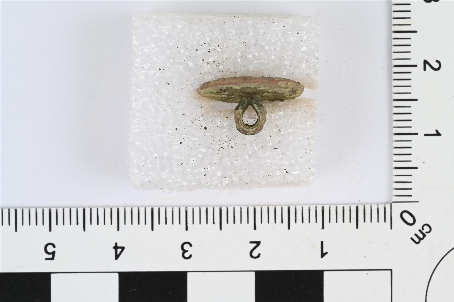 | Levymäinen nappi. Taustapuolella lenkkimäinen kanta. Taustapuolella myös mahdollinen valmistajan merkki, reunan ja kannan välissä kuviokehä, jossa erottuu mahdollisia kirjaimia. Merkintä on samanlainen kuin napeissa KM 46000:5-7,11-13. | |