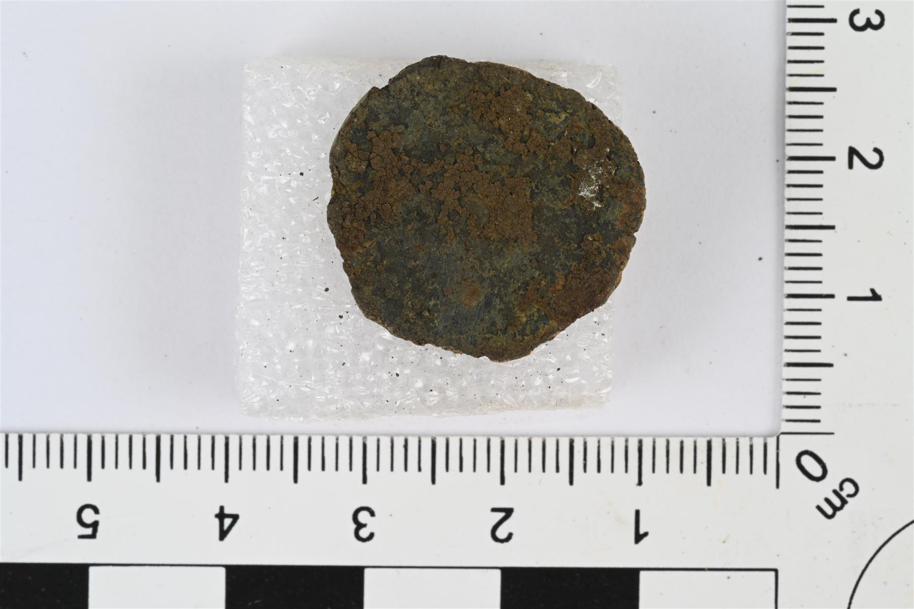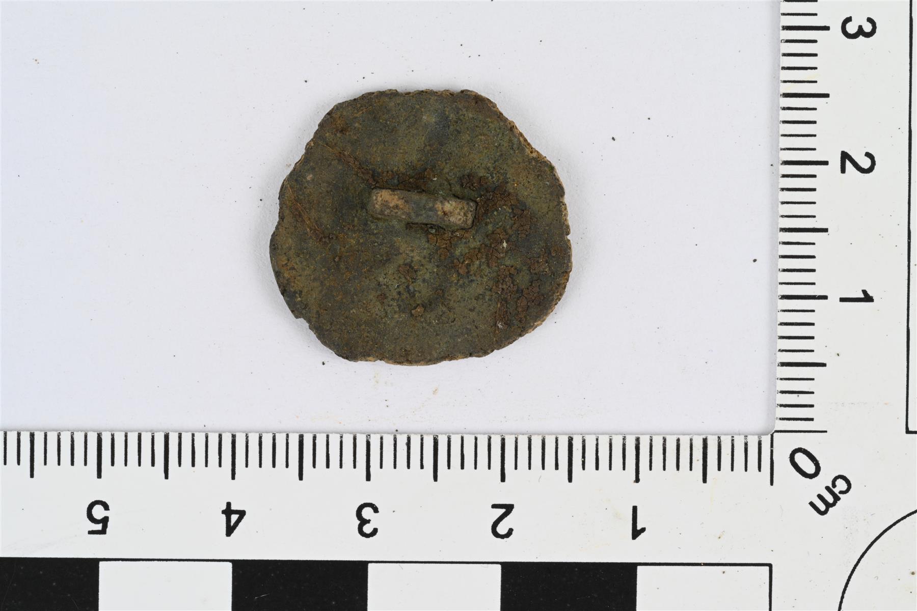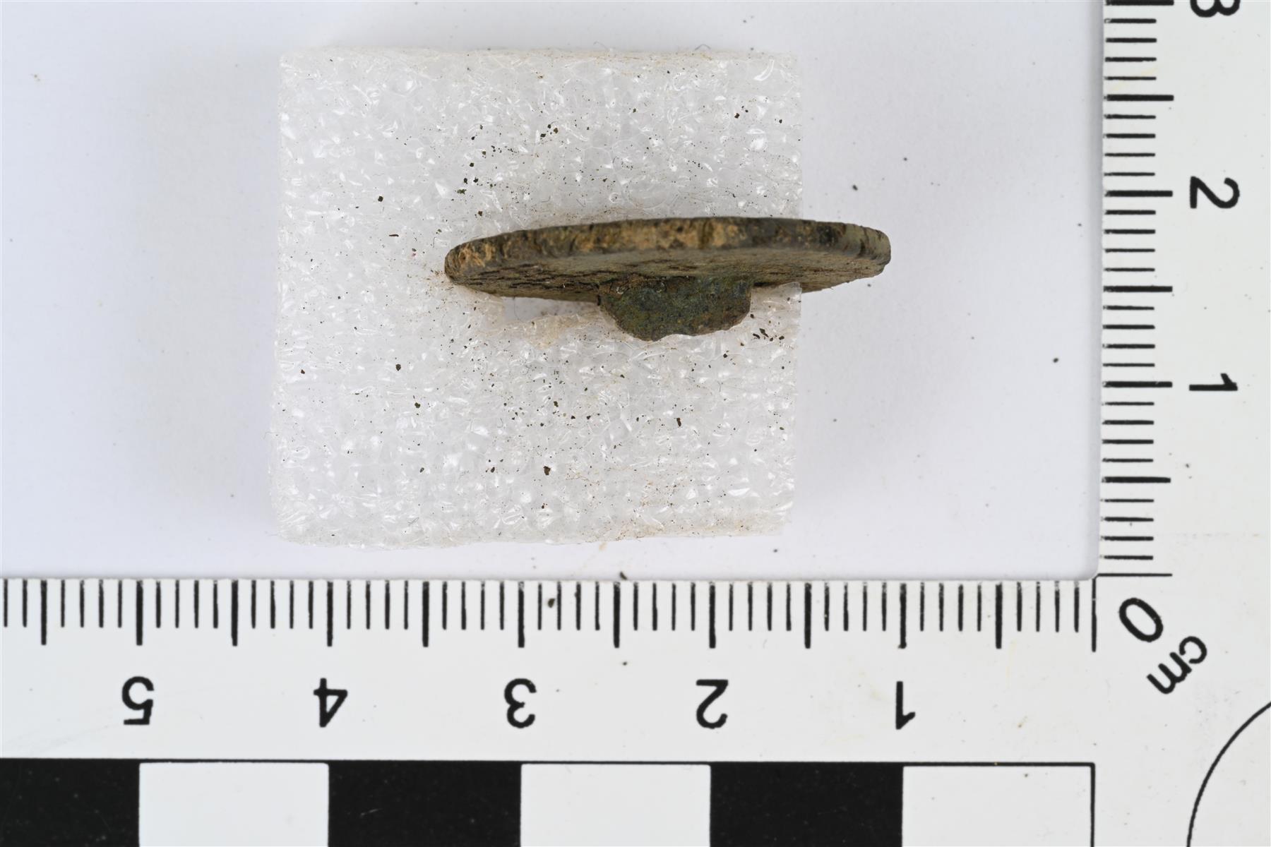 | Levymäinen nappi. Taustapuolelta katkennut kanta. Sileä ja koristelematon. Reuna murtunut. | |