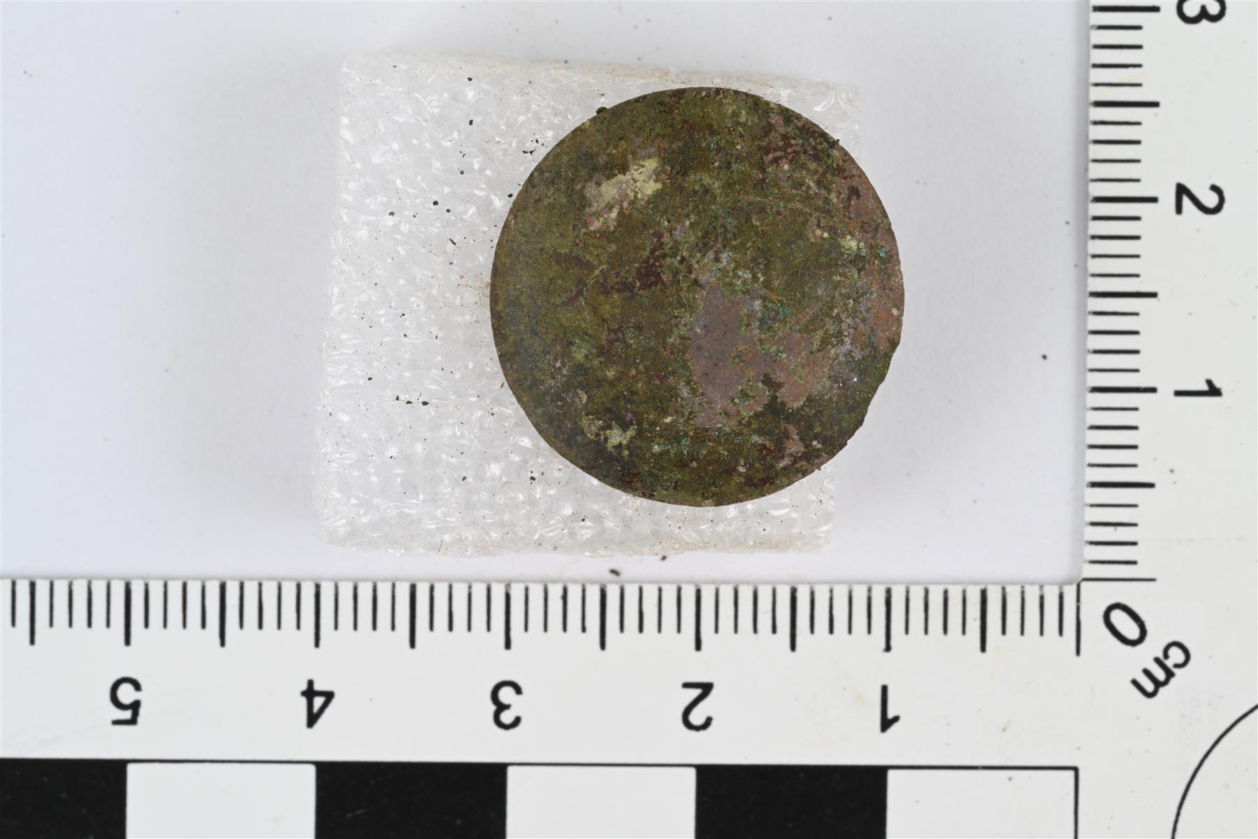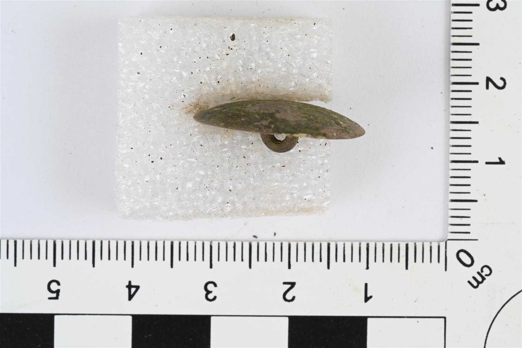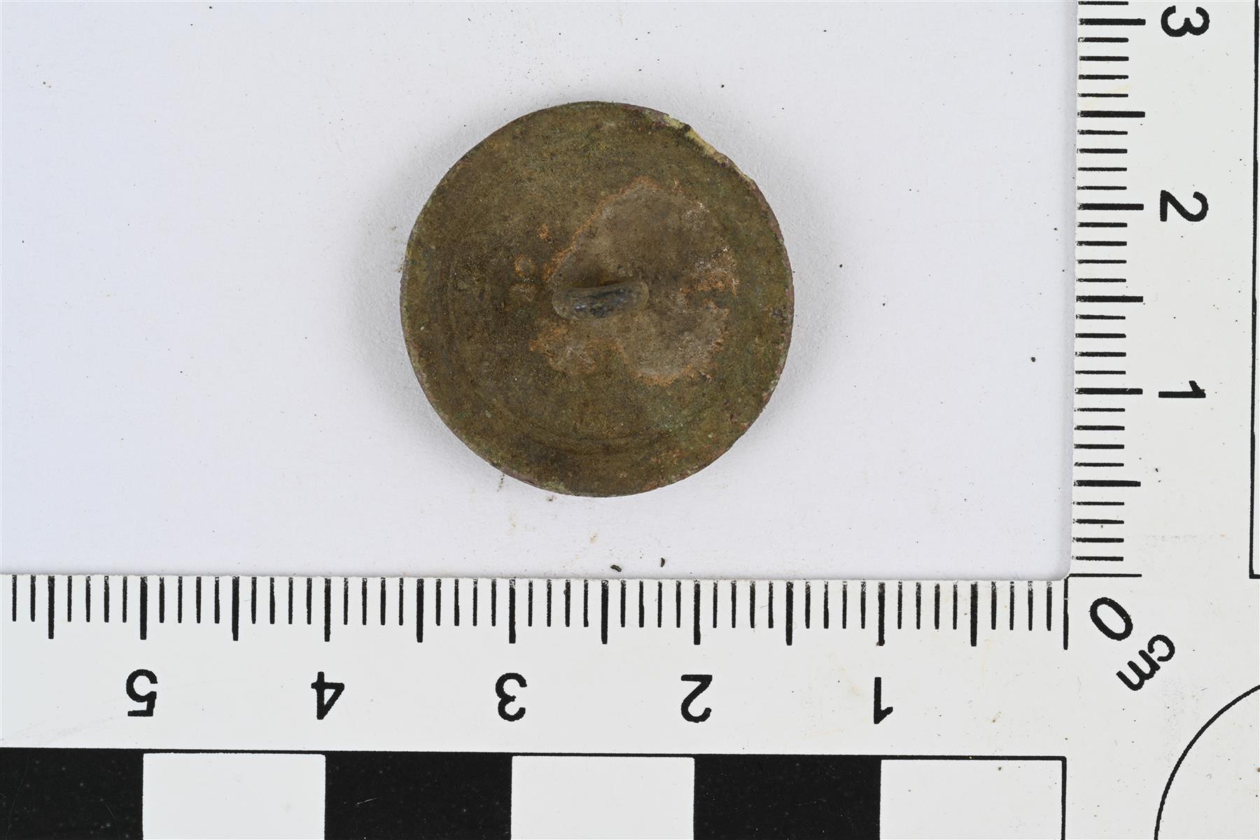 | Levymäinen, etupuolelta kupera ja taustapuolelta kovera nappi. Taustapuolella lenkkimäinen kanta. Taustapuolella myös mahdollinen valmistajan merkki, reunan ja kannan välissä heikosti erottuva kuviokehä. Merkintä on samanlainen kuin napeissa KM 46000:5-7,9,12,13. | |