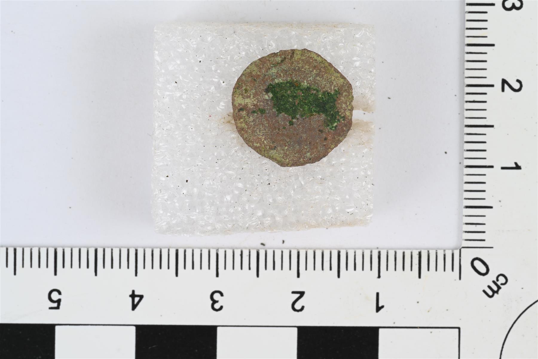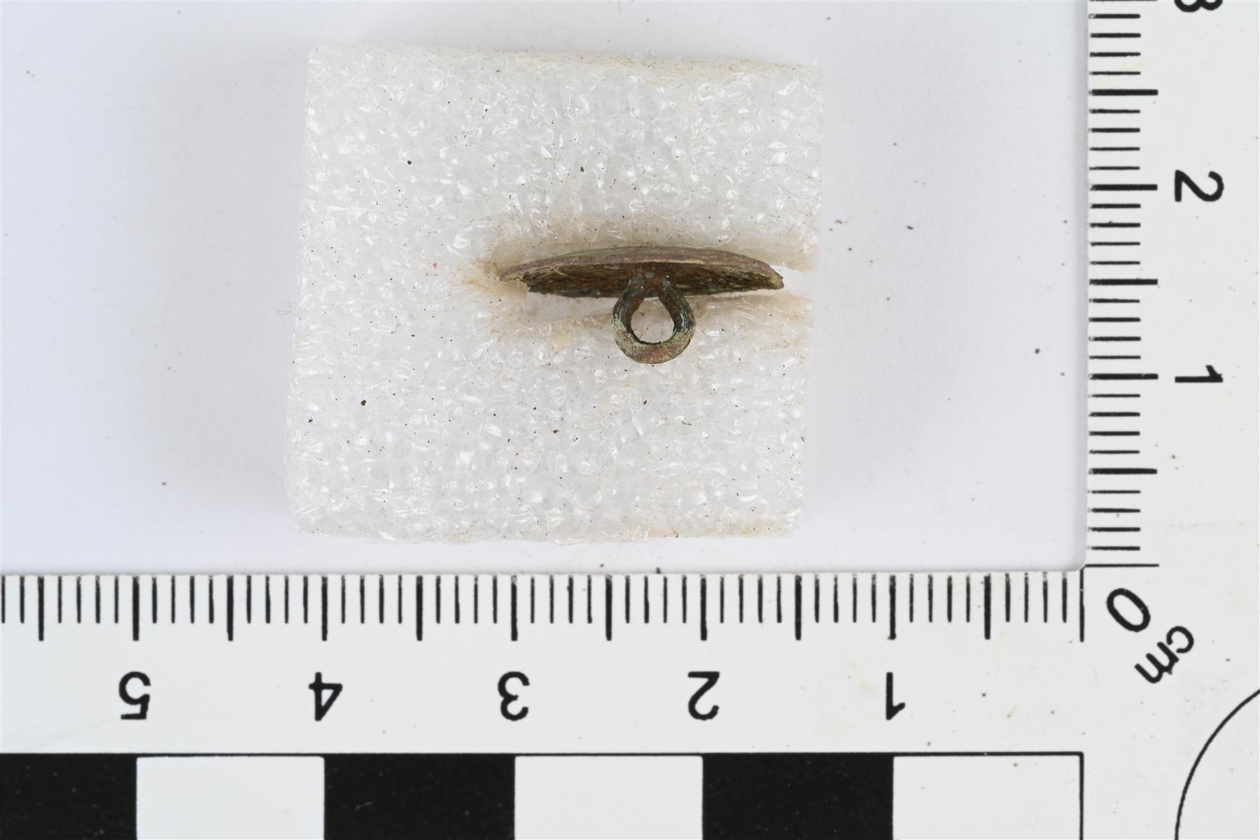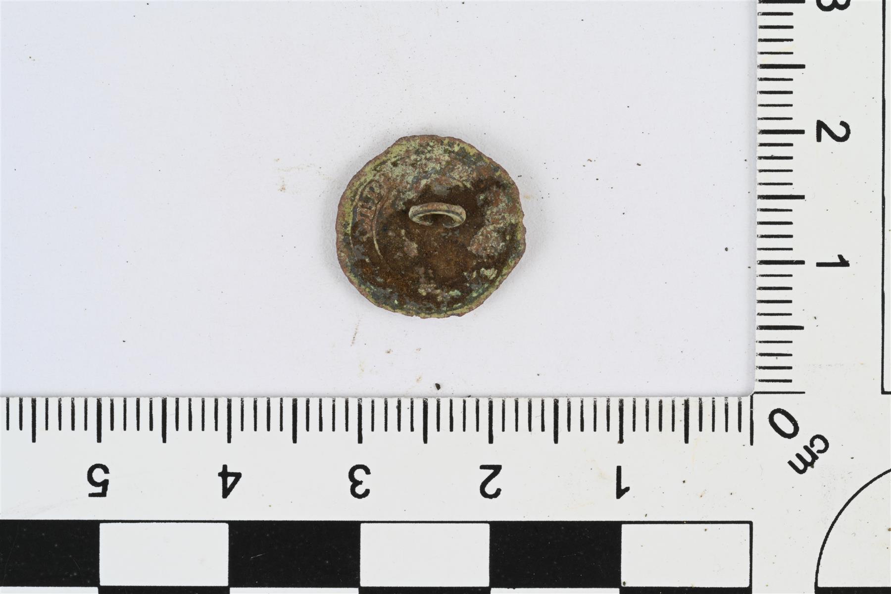 | Levymäinen, etupuolelta kupera ja taustapuolelta kovera nappi. Taustapuolella lenkkimäinen kanta. Taustapuolella myös mahdollinen valmistajan merkki, reunan ja kannan välissä kuviokehä, jossa erottuu luultavasti kyrillisiä kirjaimia. Merkintä on samanlainen kuin napeissa KM 46000:5-7,9,11,12. | |